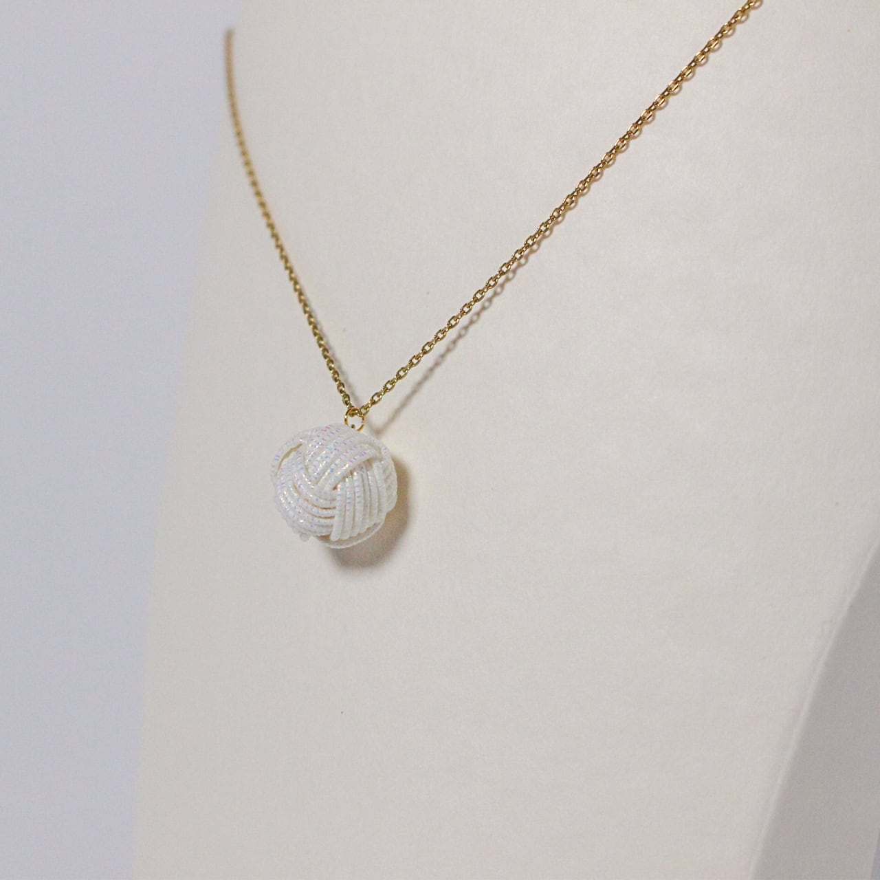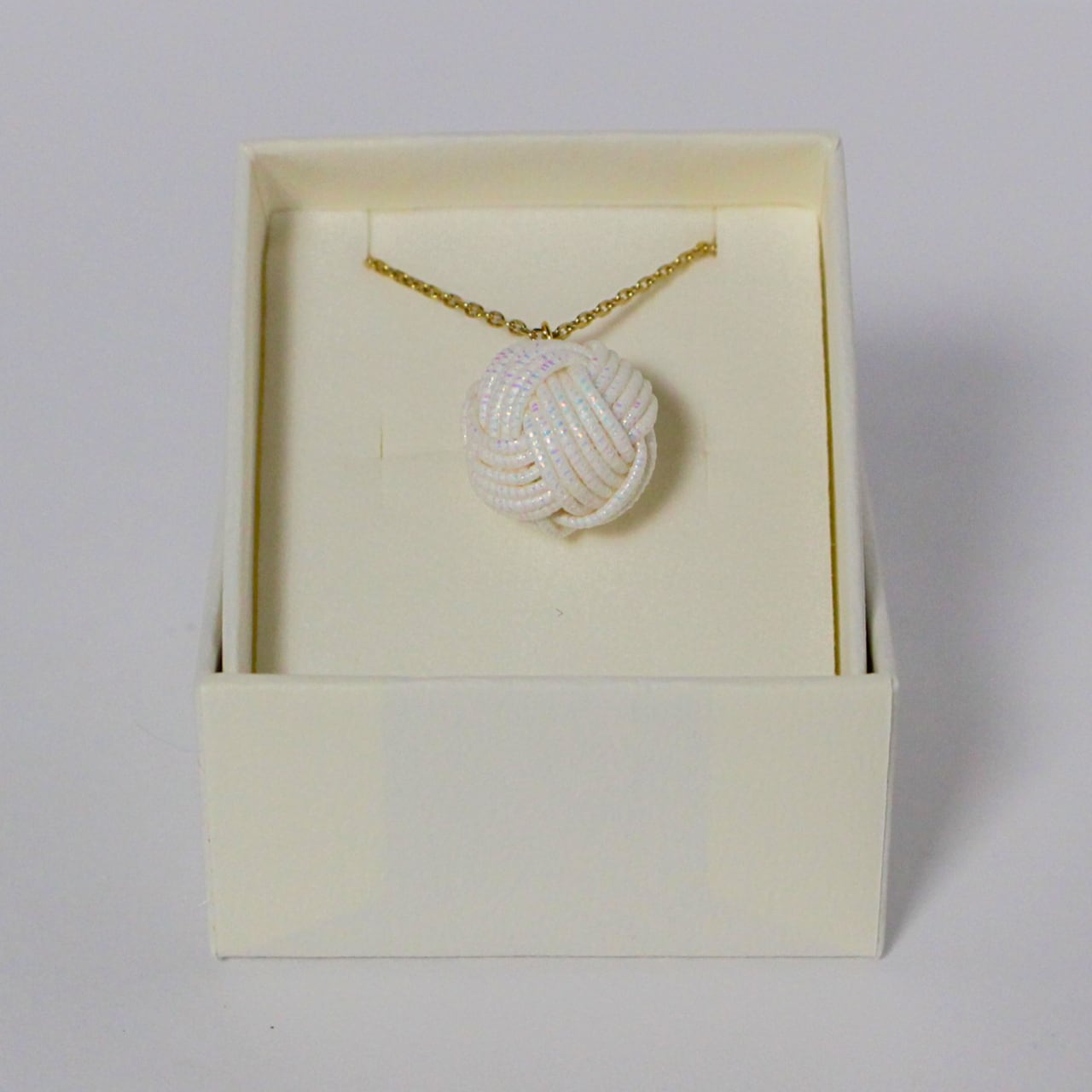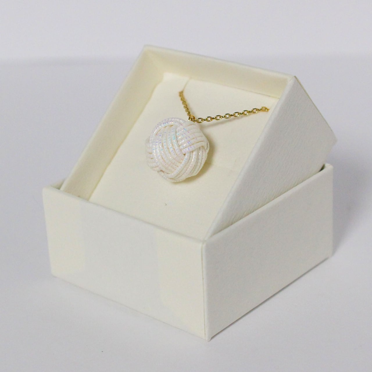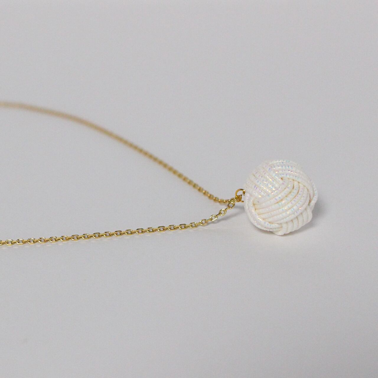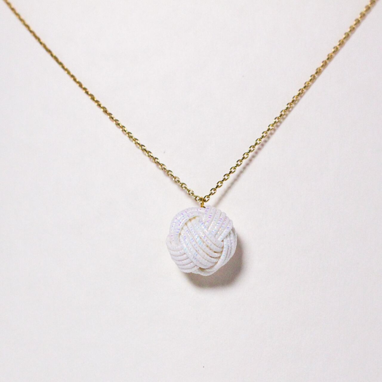 水引パール ネックレスは、丸くまとまり末永く続くご縁を願ってひとつひとつ手で大切に結ばれたあわじ玉結びを身にまとうアクセサリーです。およそ15mmの大粒あわじ玉結びは、まるで特別な和宝石を身に着けているような奥ゆかしい気分にさせてくれます。