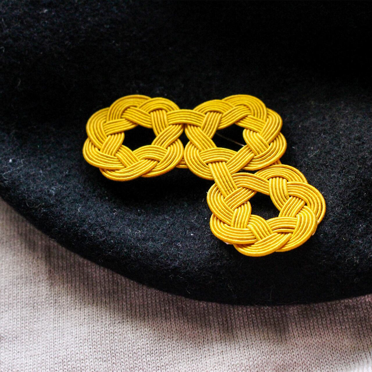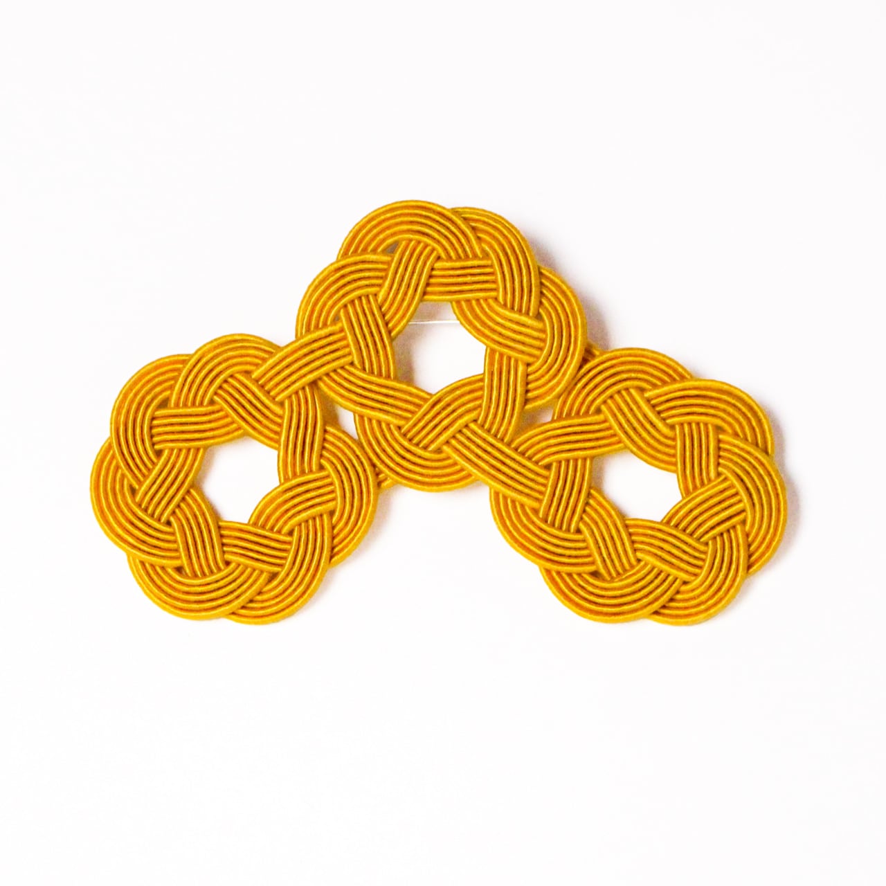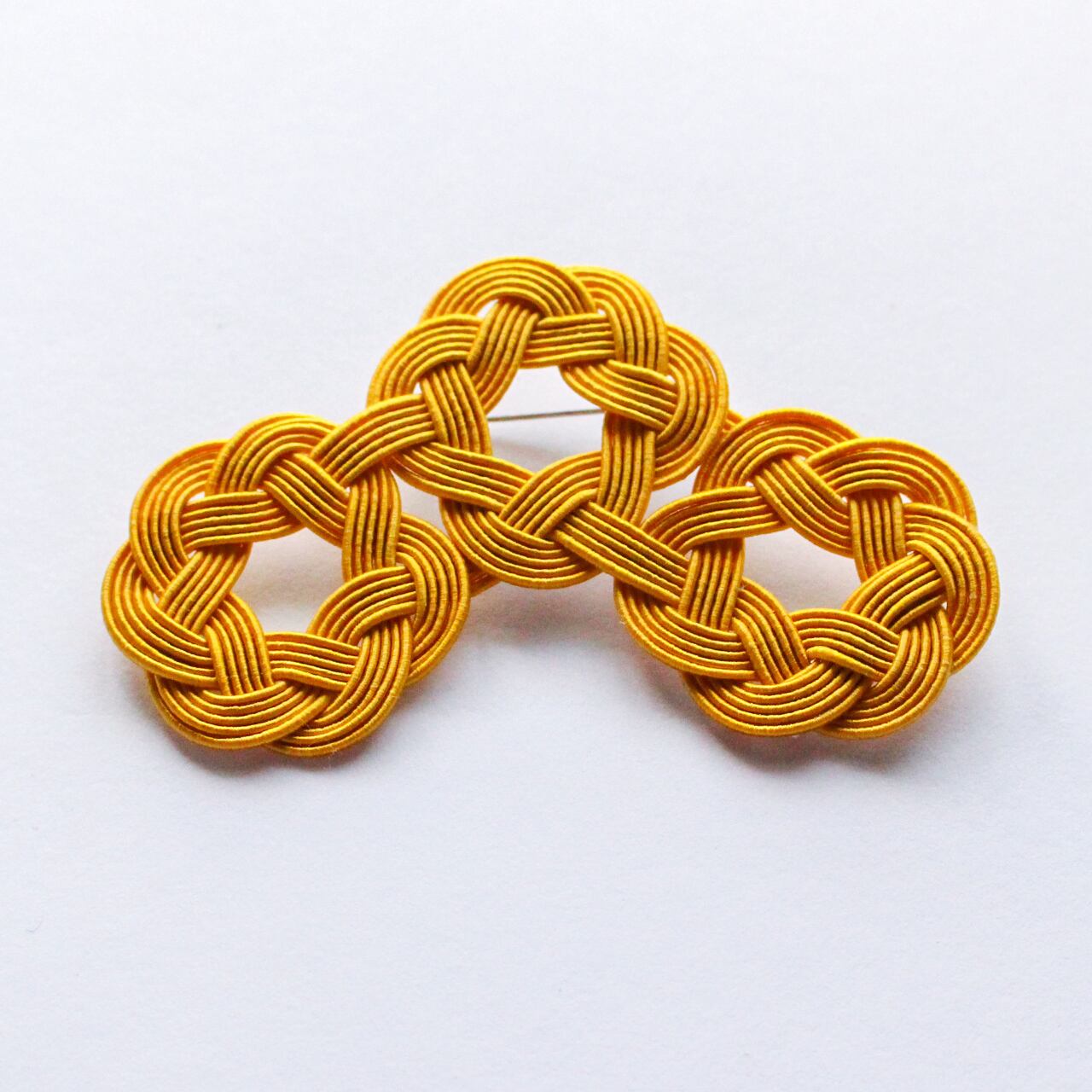 水引細工の輪が連なり、軽やかなリズムを描く、身にまとうアートアクセサリーシリーズ「WaO(ワオ)」の三つ輪ブローチ。マスタードカラー。