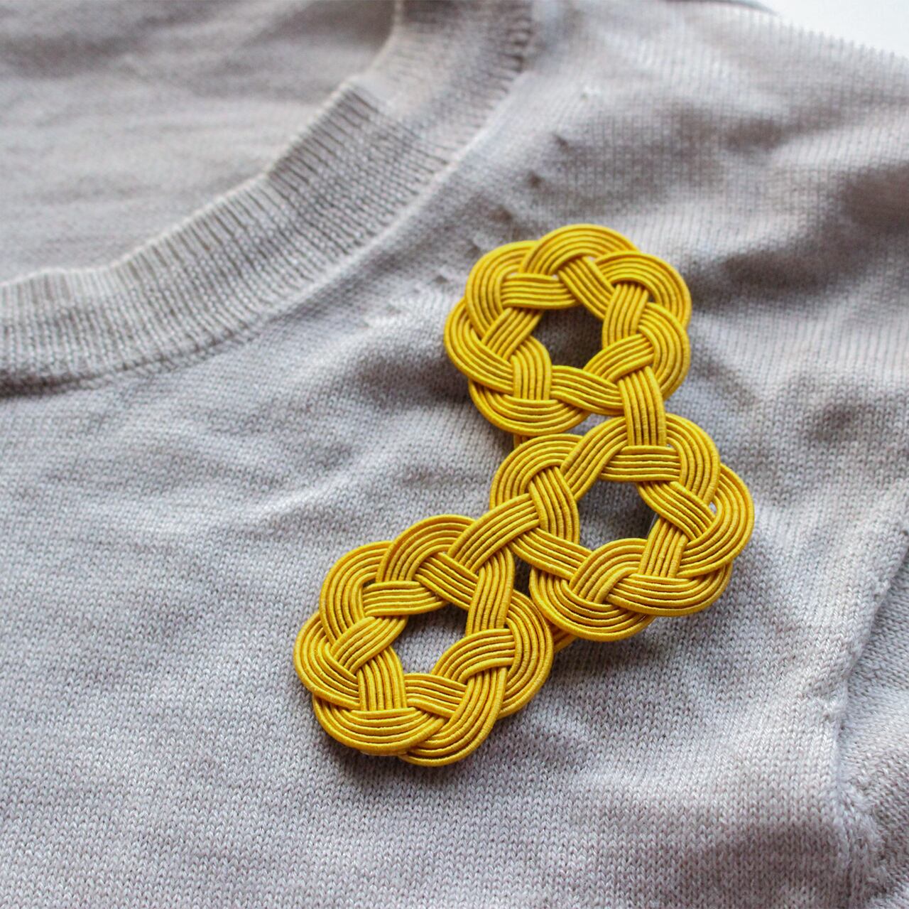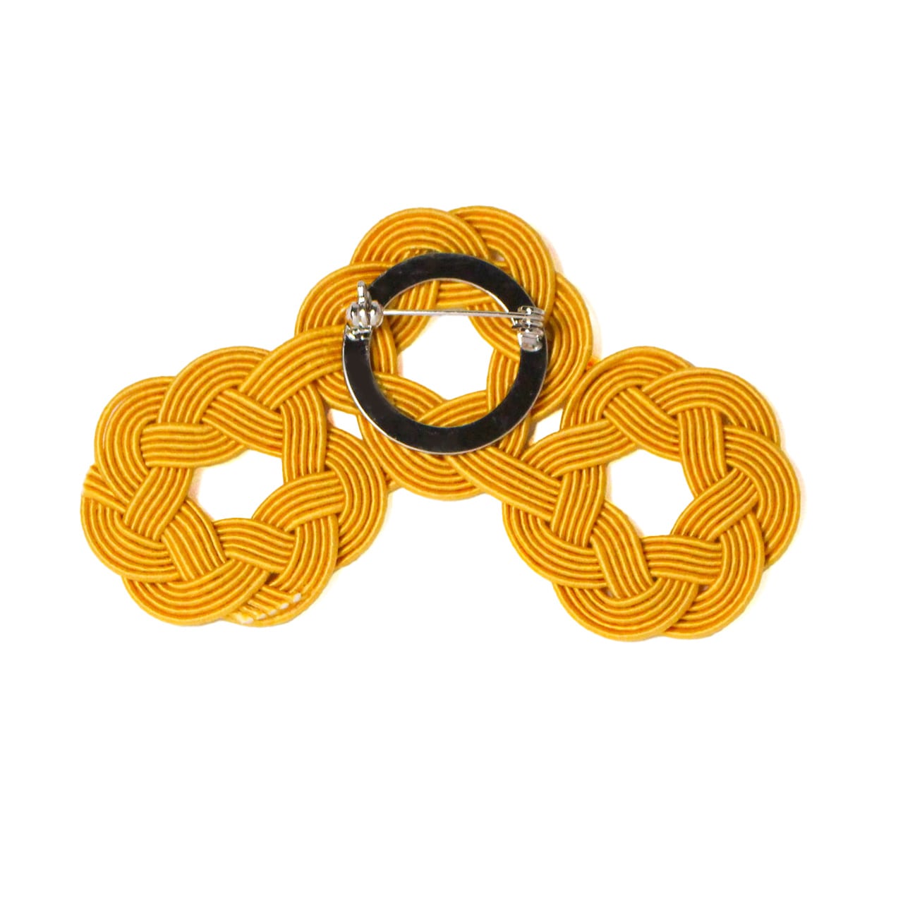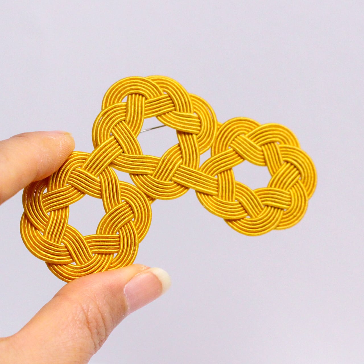 水引細工の輪が連なり、軽やかなリズムを描く、身にまとうアートアクセサリーシリーズ「WaO(ワオ)」の三つ輪ブローチ。マスタードカラー。