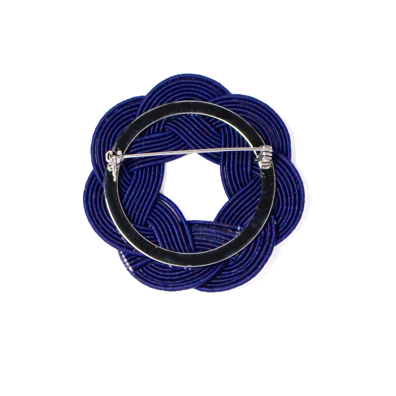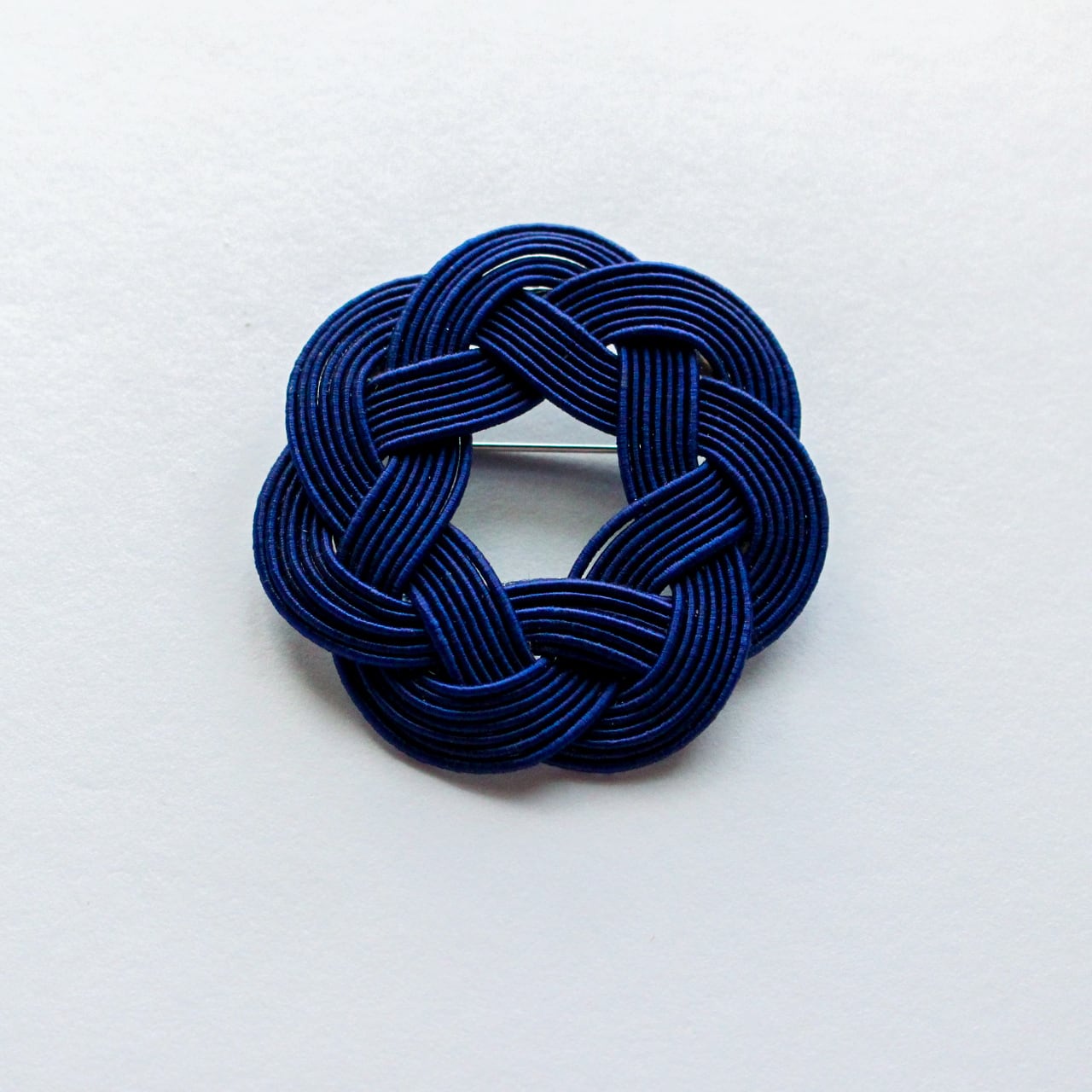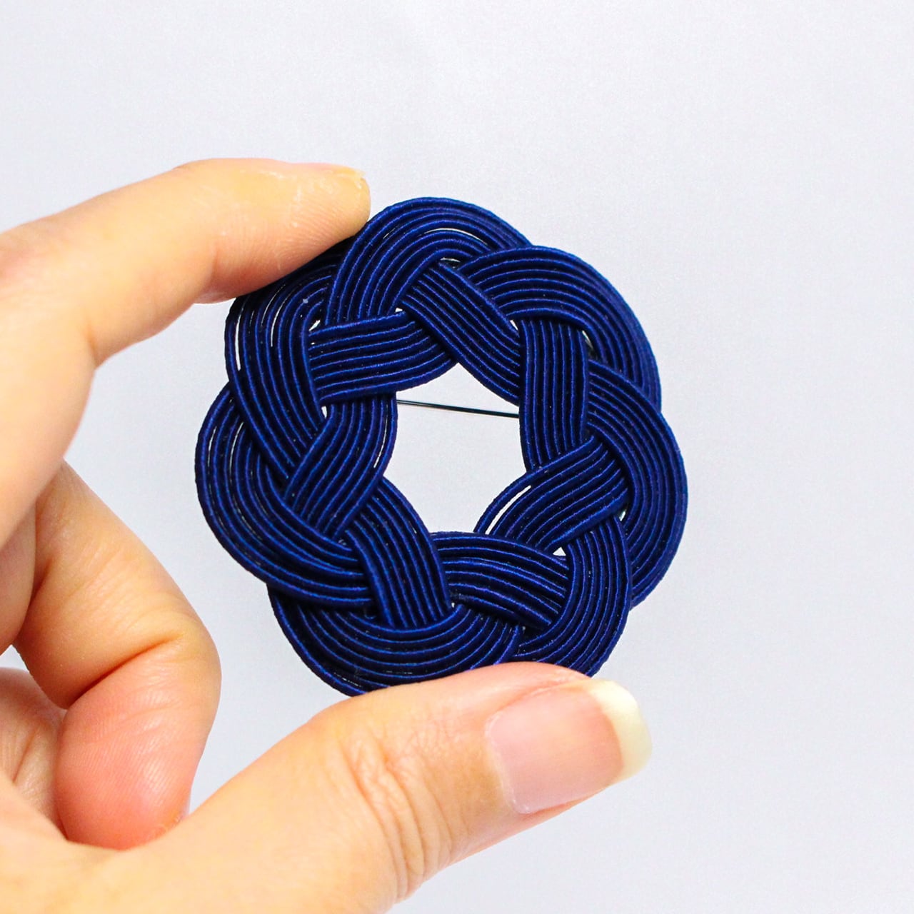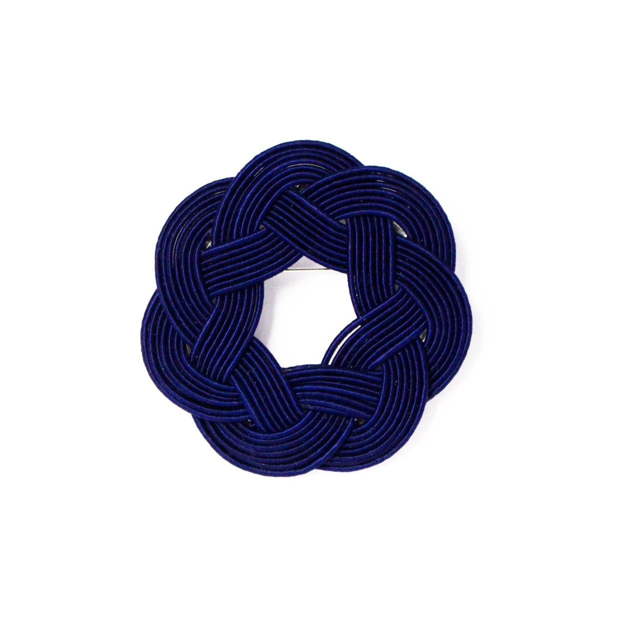 水引細工の輪が連なり、軽やかなリズムを描く、身にまとうアートアクセサリーシリーズ「WaO(ワオ)」の一つ輪ブローチ。ネイビーカラー。