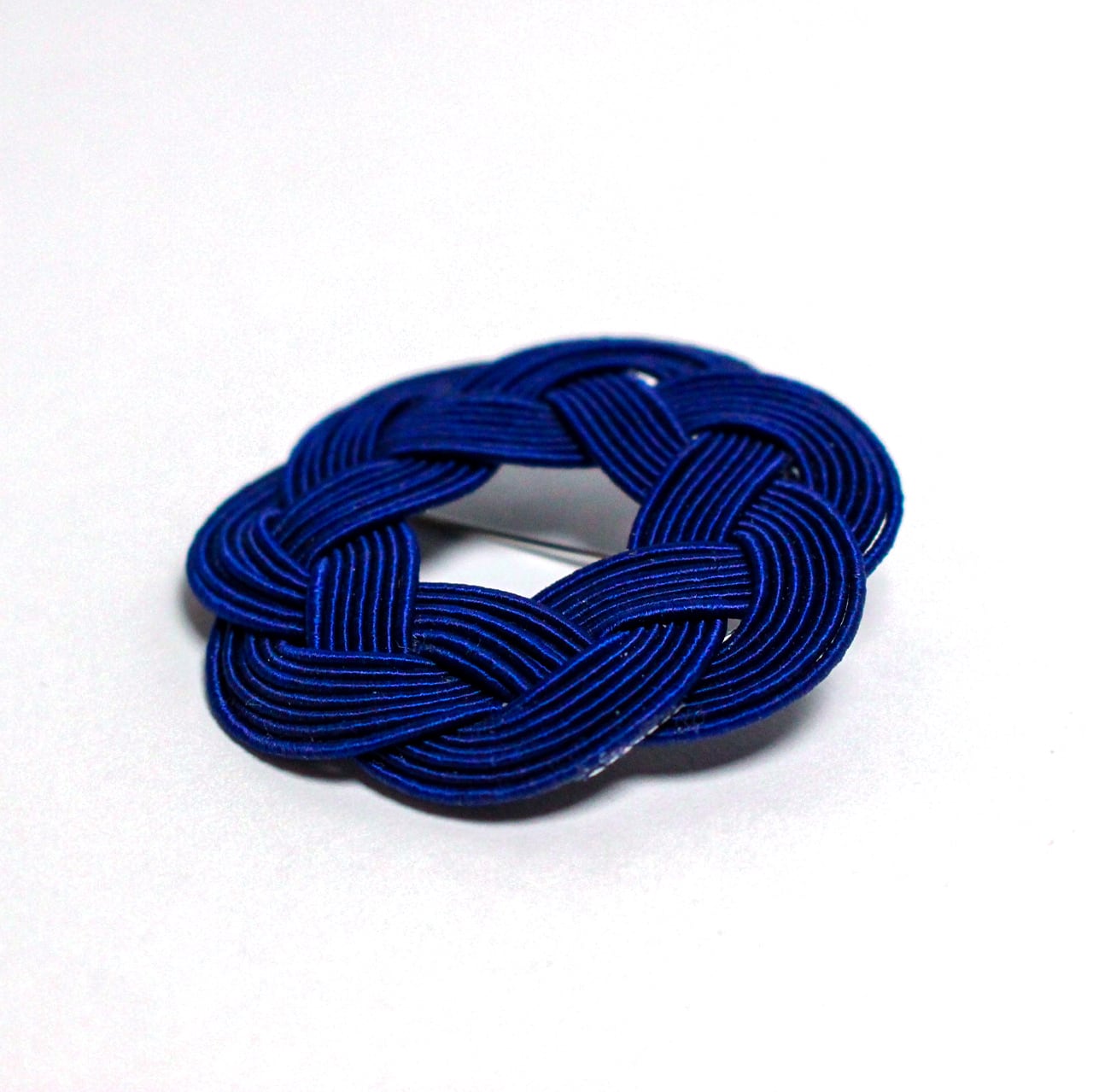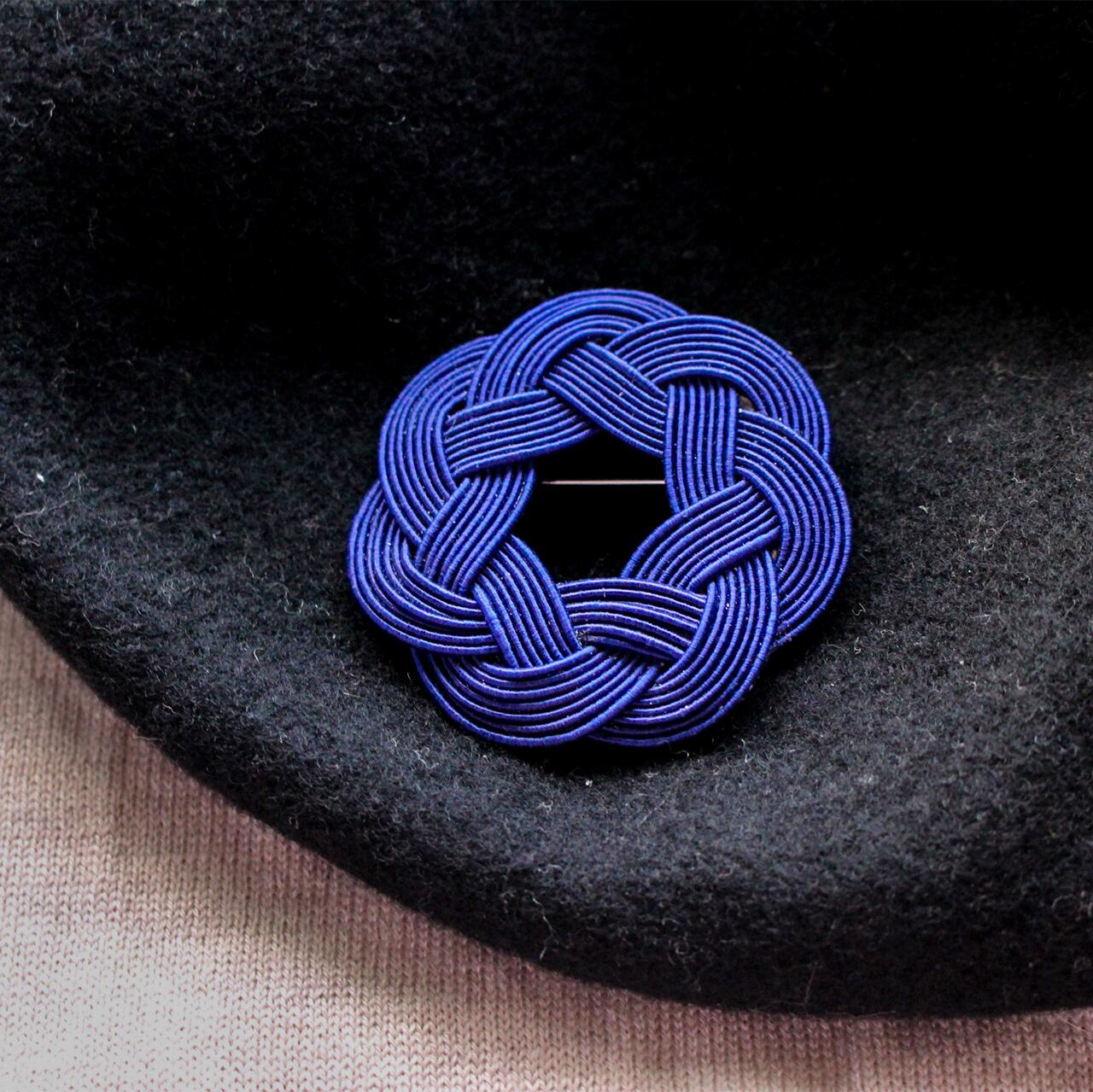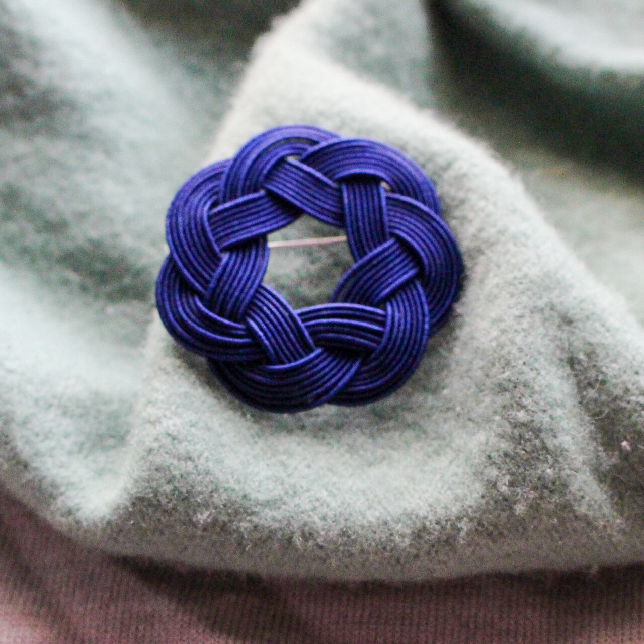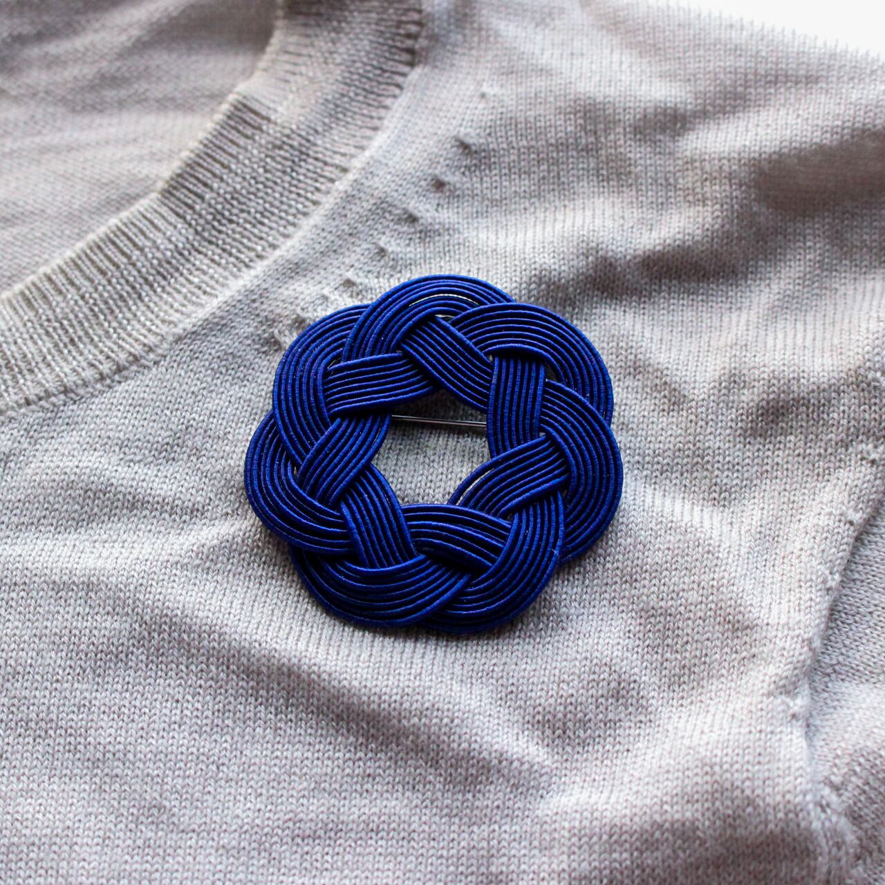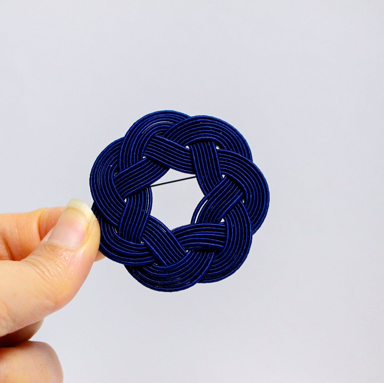 水引細工の輪が連なり、軽やかなリズムを描く、身にまとうアートアクセサリーシリーズ「WaO(ワオ)」の一つ輪ブローチ。ネイビーカラー。