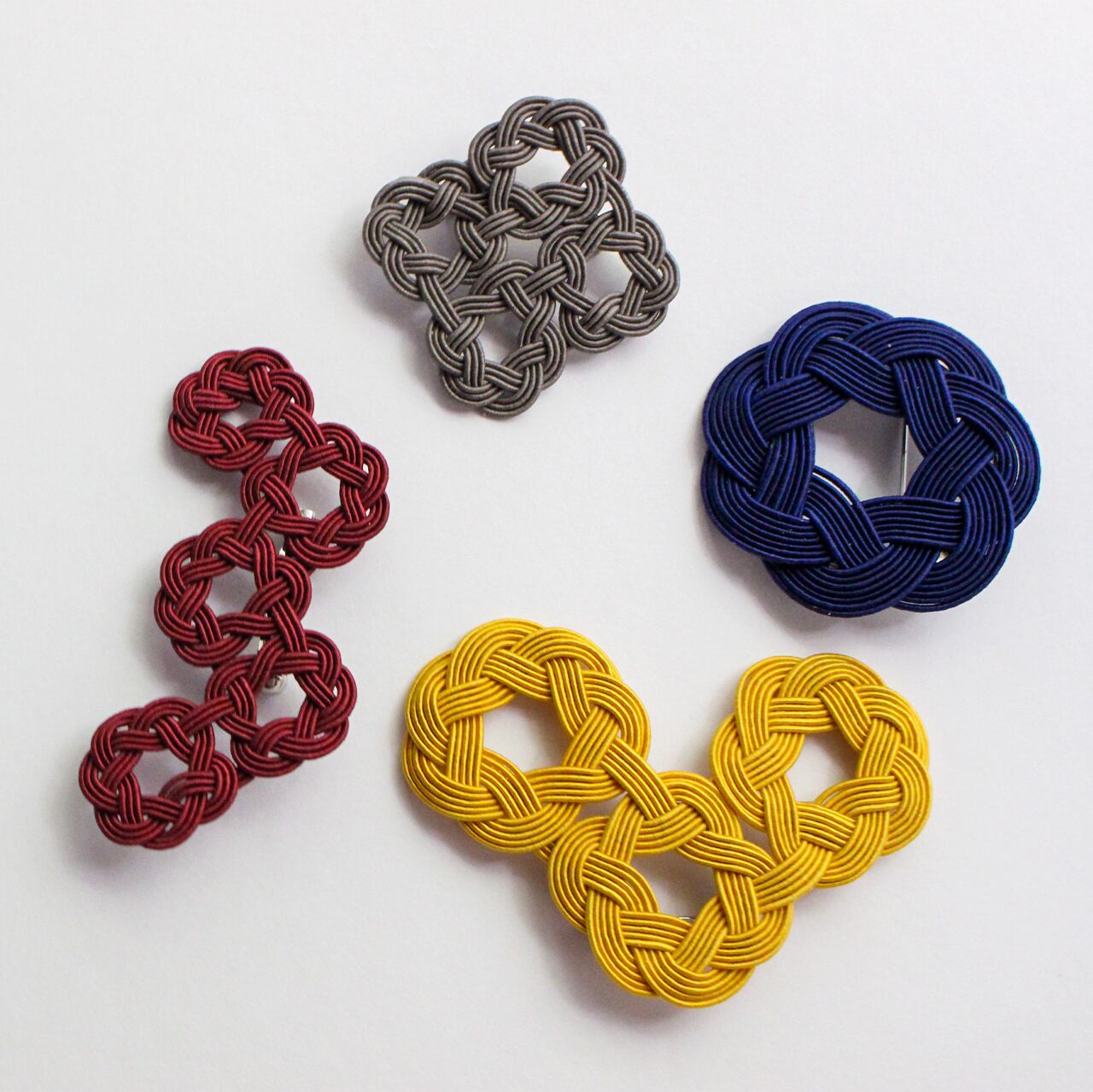 水引細工の輪が連なり、軽やかなリズムを描く、身にまとうアートアクセサリーシリーズ「WaO(ワオ)」の四つ輪ブローチ。チャコールグレーカラー。