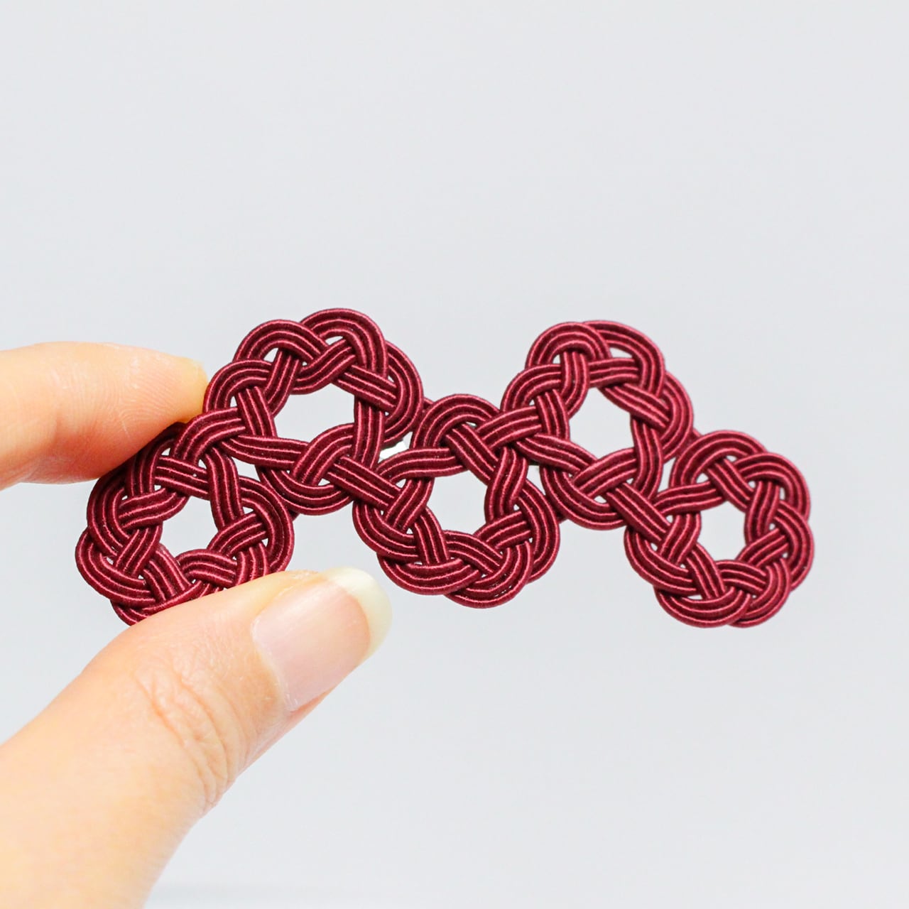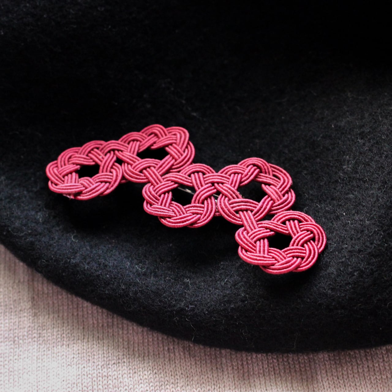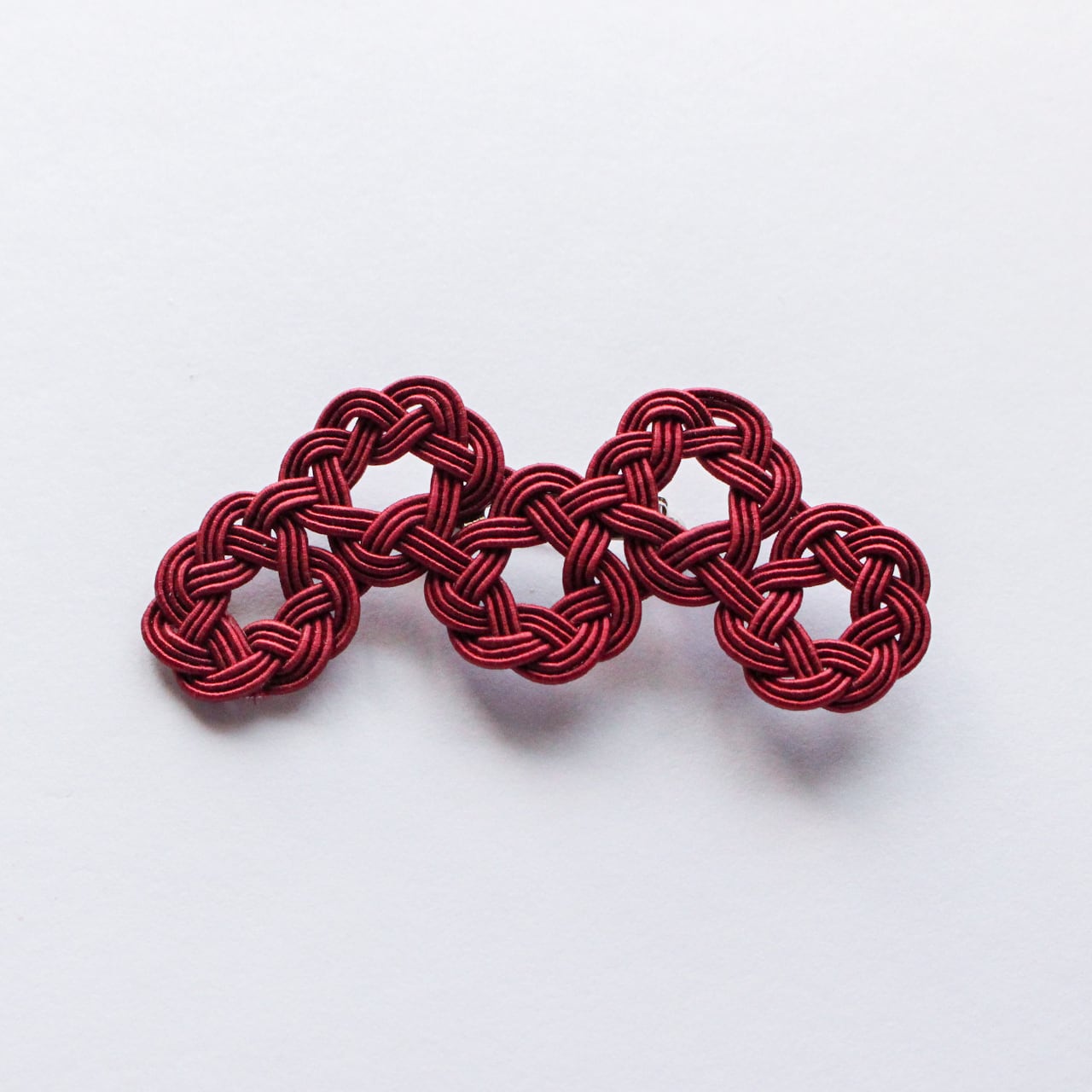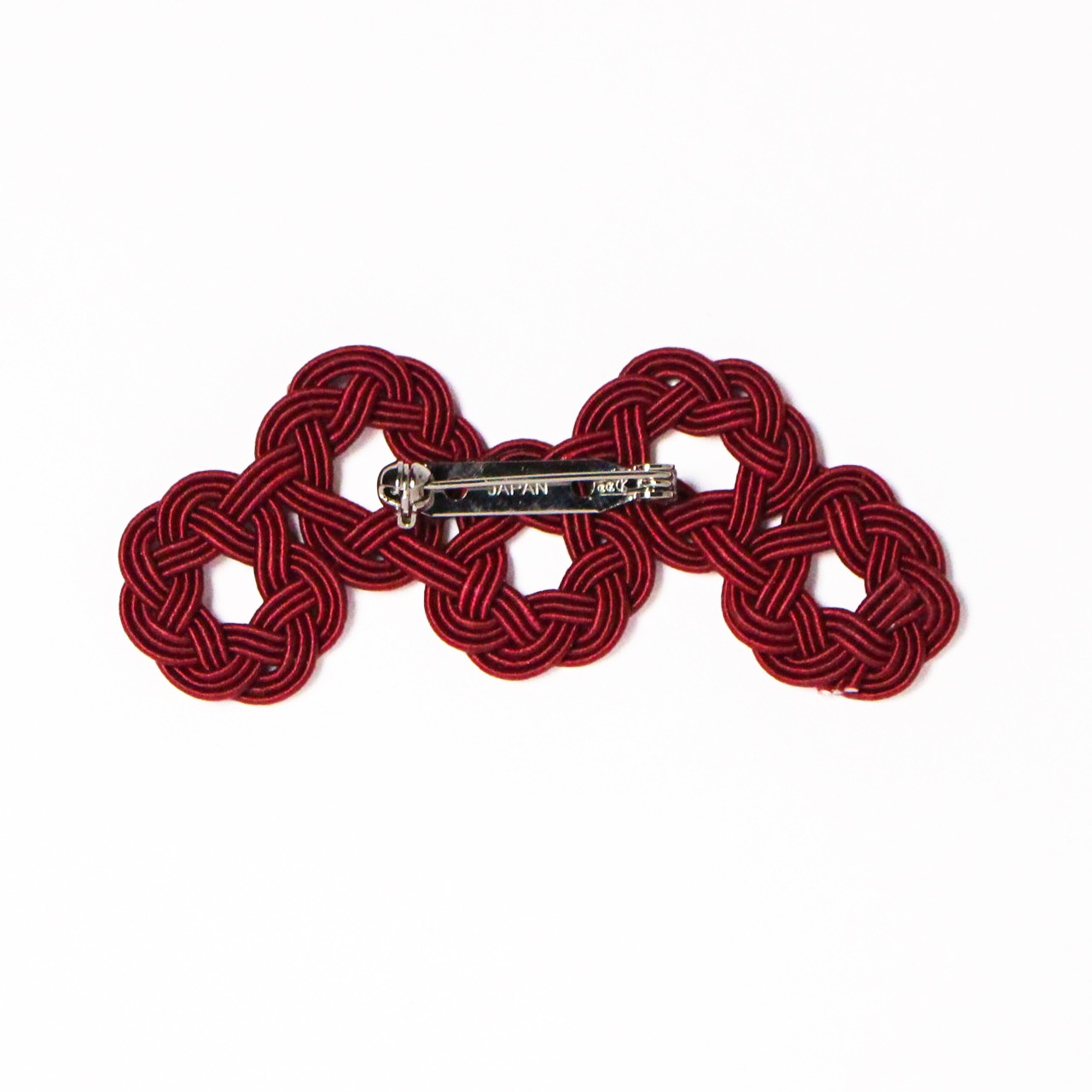 水引細工の輪が連なり、軽やかなリズムを描く、身にまとうアートアクセサリーシリーズ「WaO(ワオ)」の五つ輪ブローチ。ボルドーカラー。