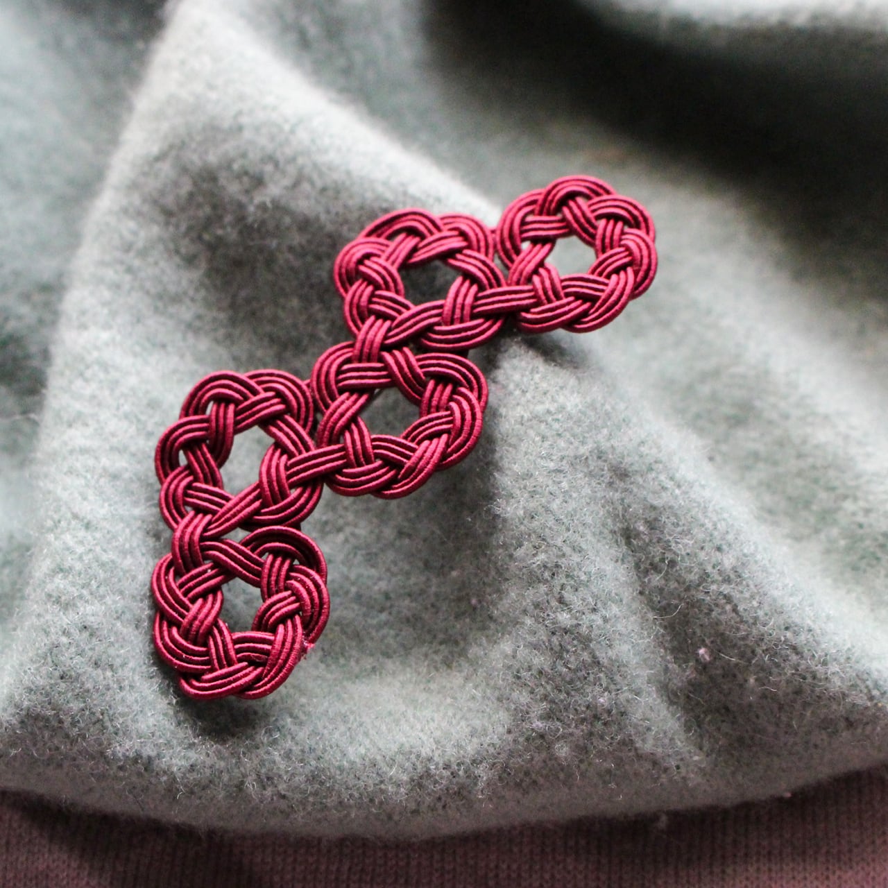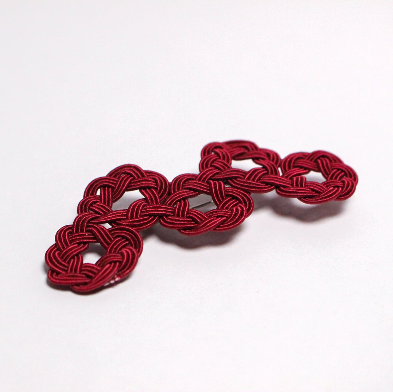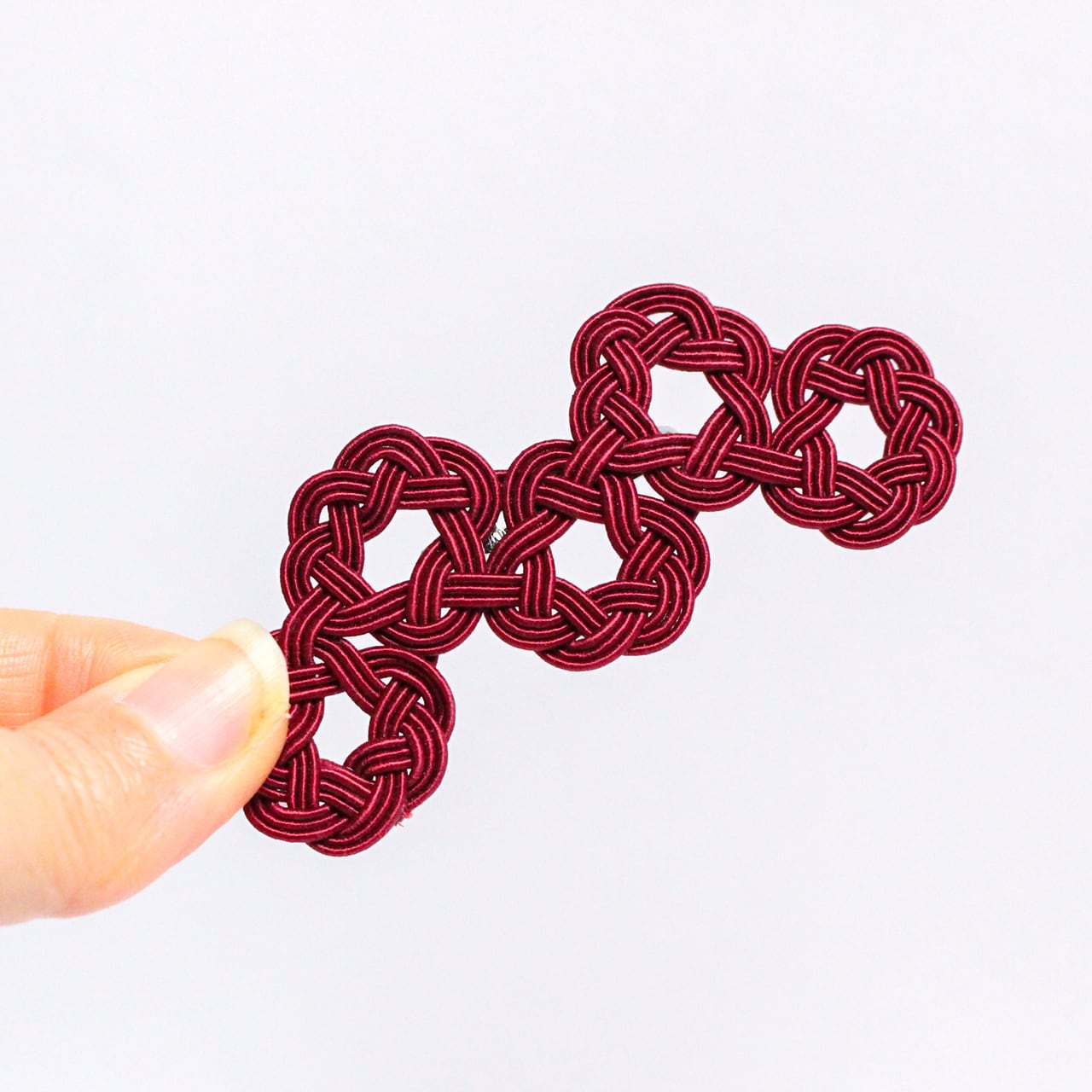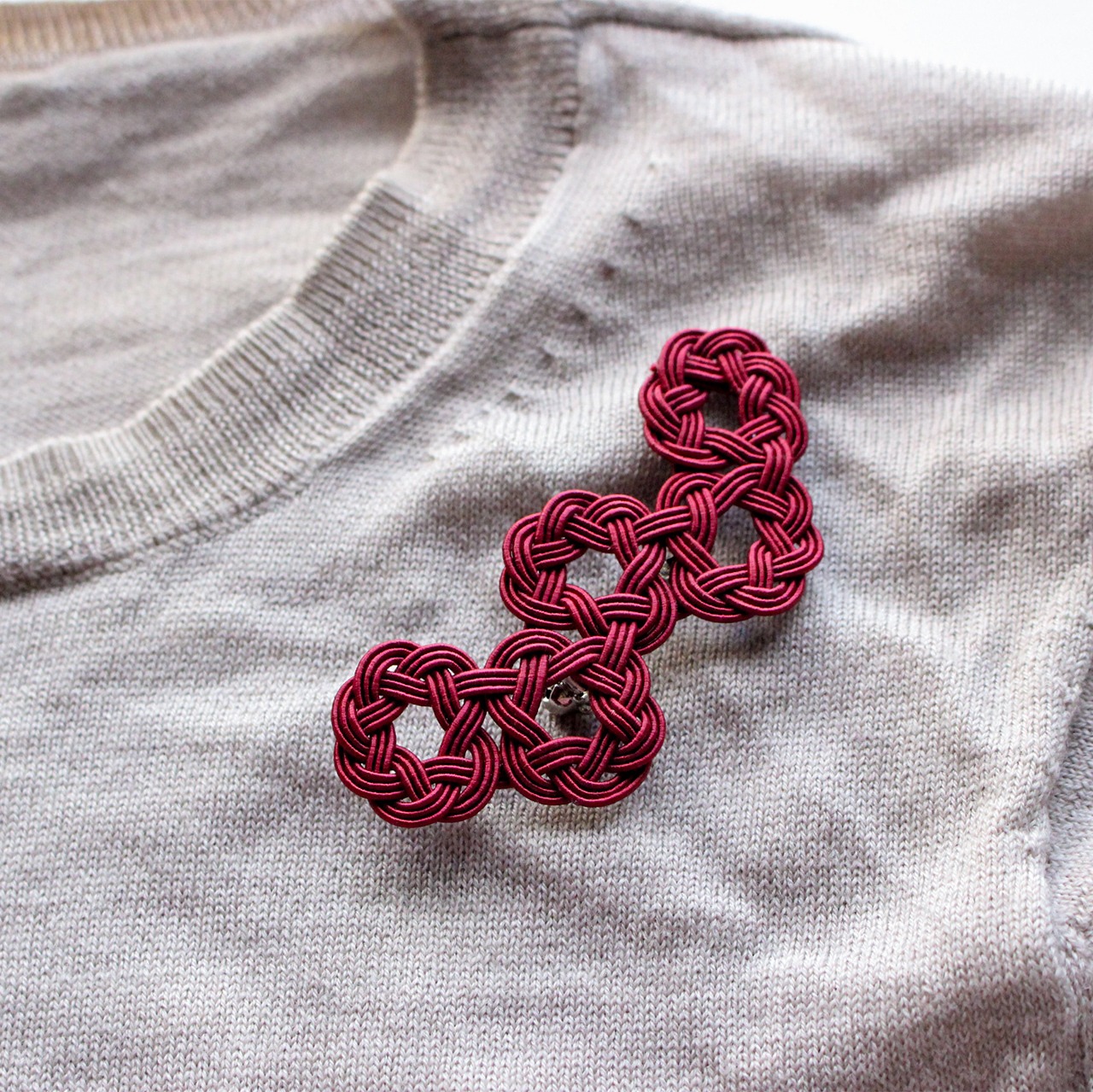 水引細工の輪が連なり、軽やかなリズムを描く、身にまとうアートアクセサリーシリーズ「WaO(ワオ)」の五つ輪ブローチ。ボルドーカラー。