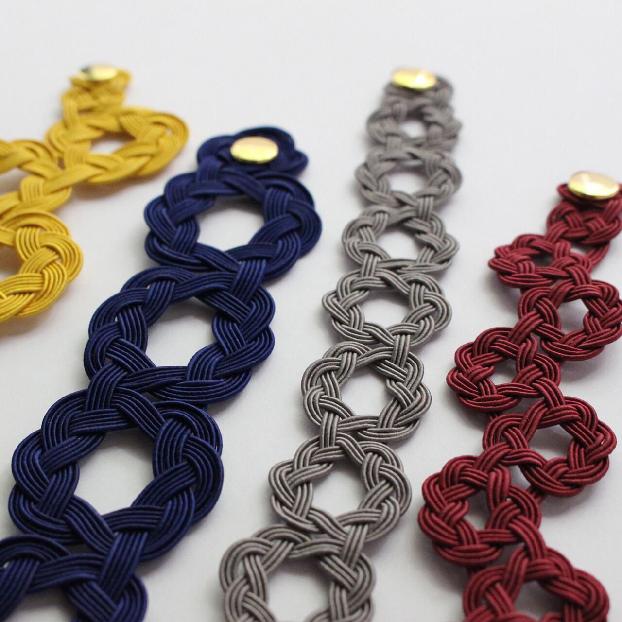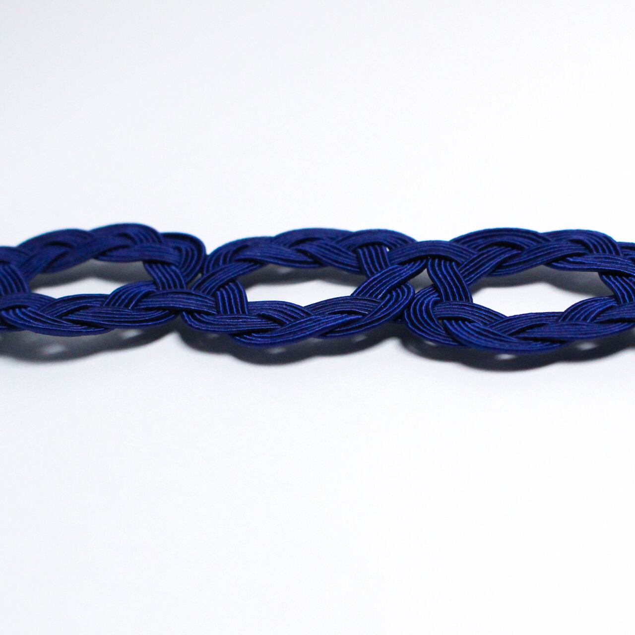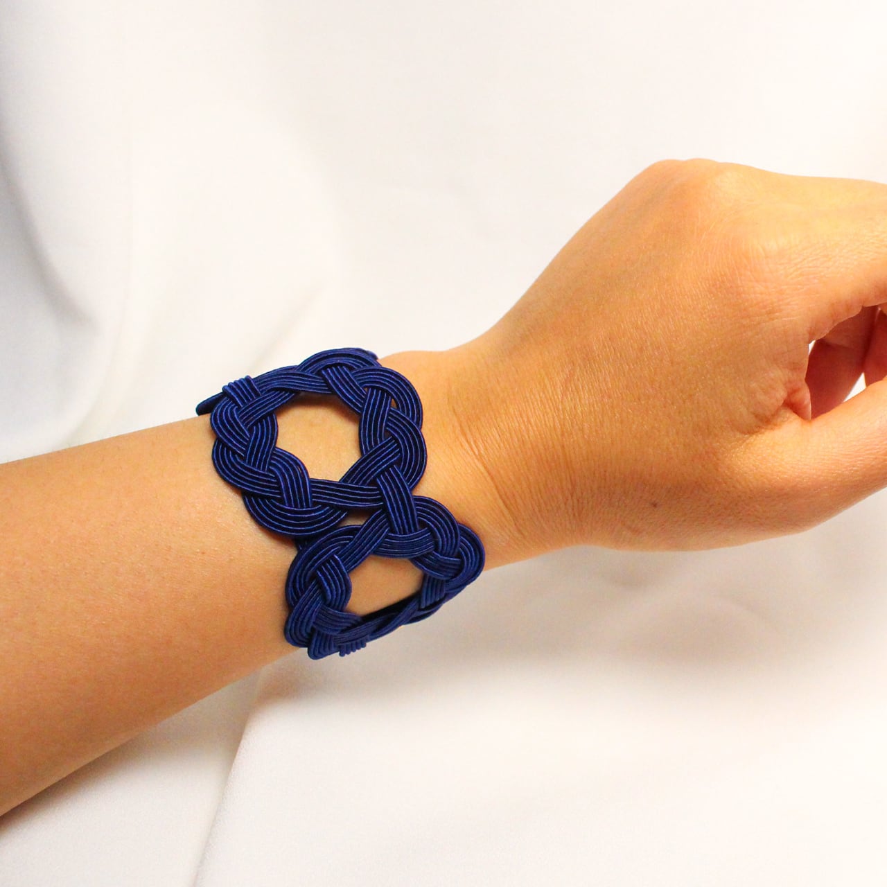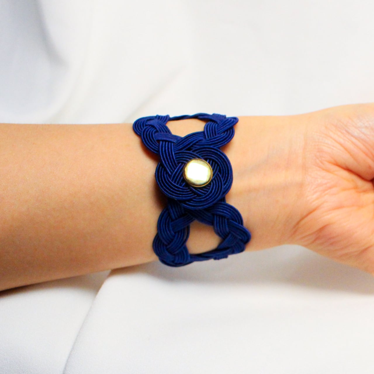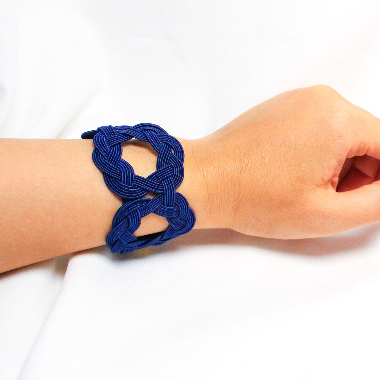 水引細工の輪が連なり、手元に軽やかなリズムを生むアートアクセサリーシリーズ「WaO(ワオ)」のブレスレット。ネイビーカラー。