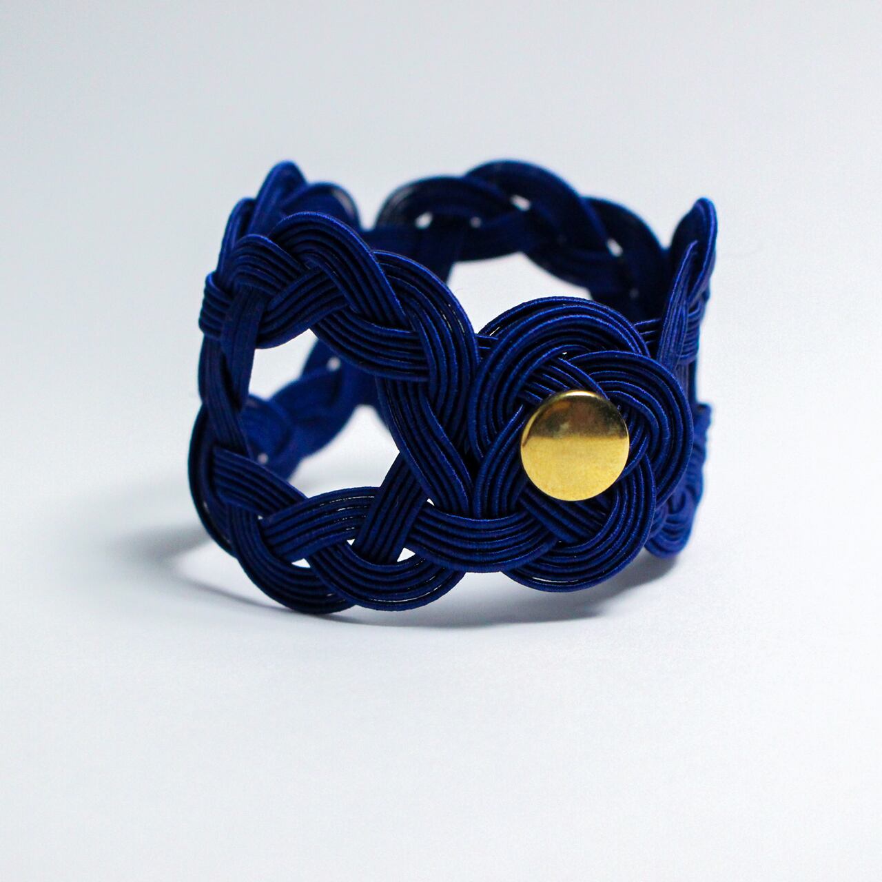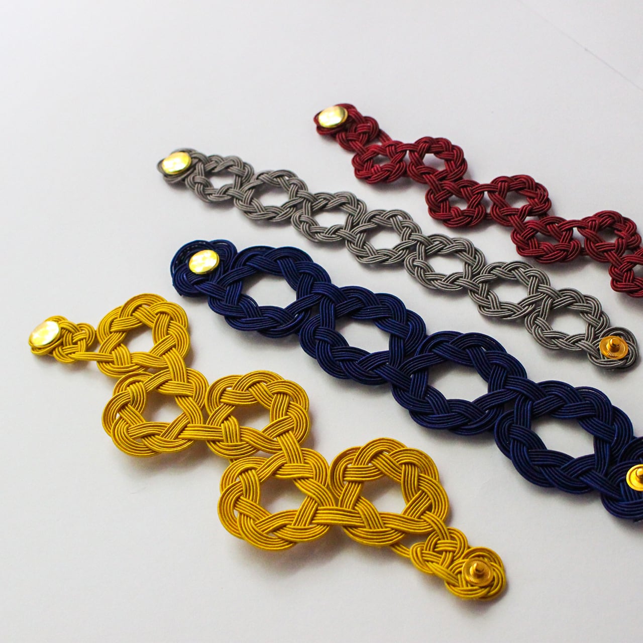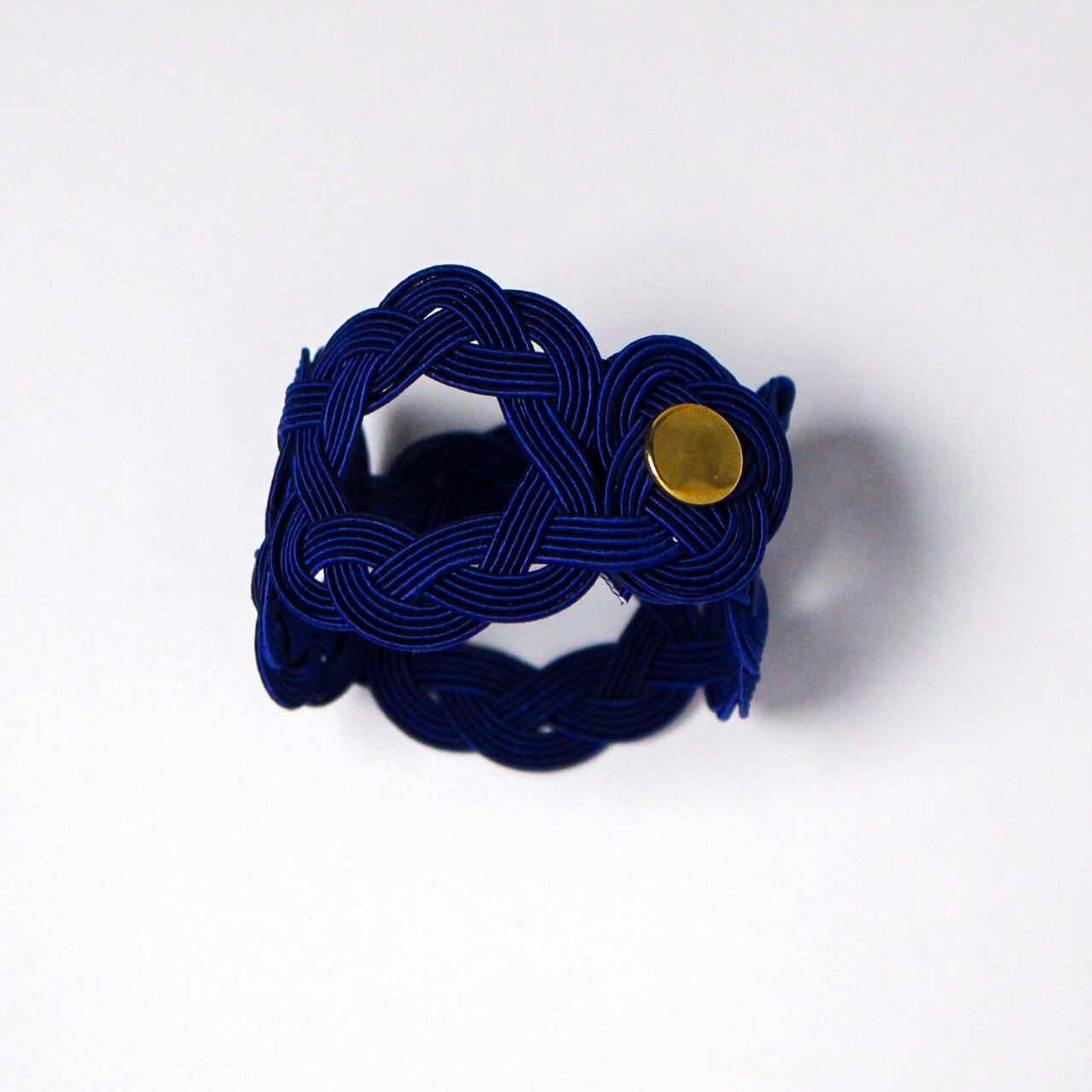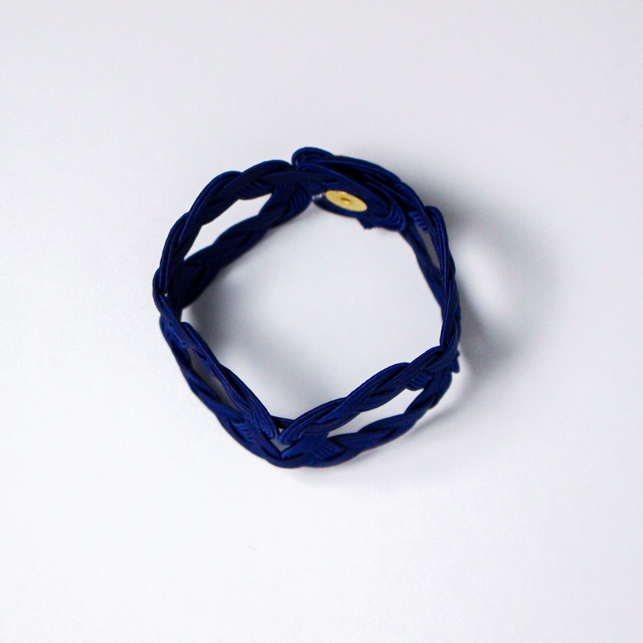 水引細工の輪が連なり、手元に軽やかなリズムを生むアートアクセサリーシリーズ「WaO(ワオ)」のブレスレット。ネイビーカラー。