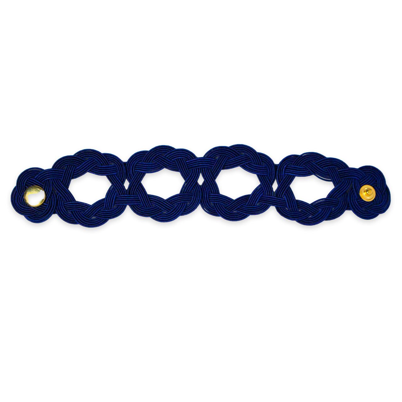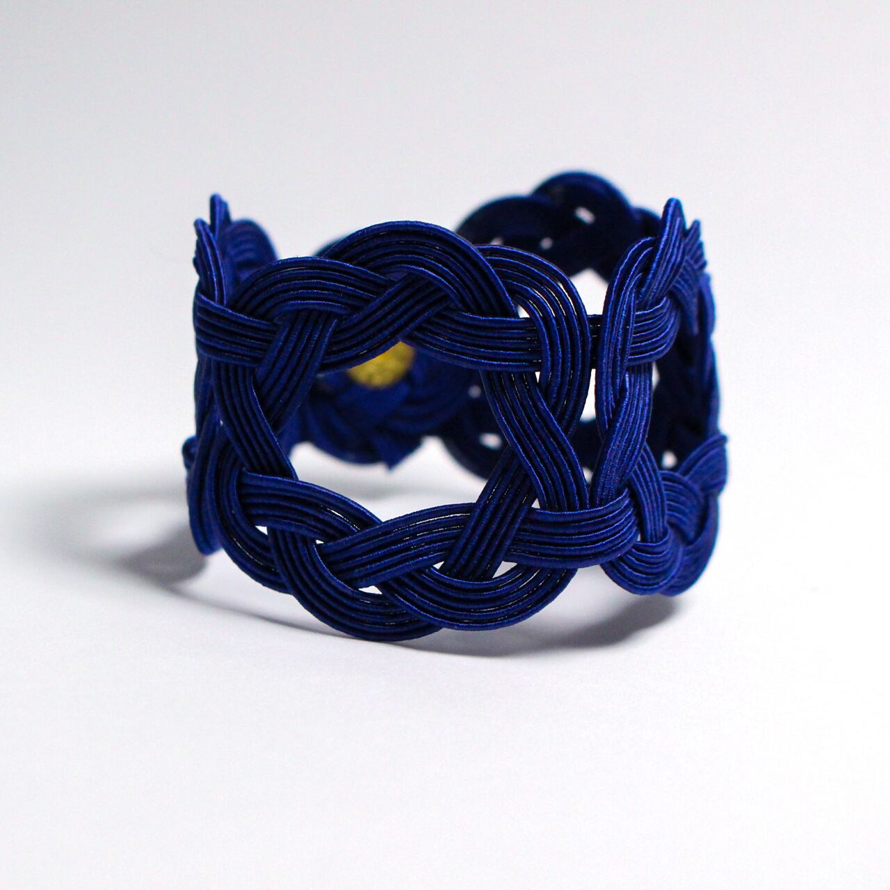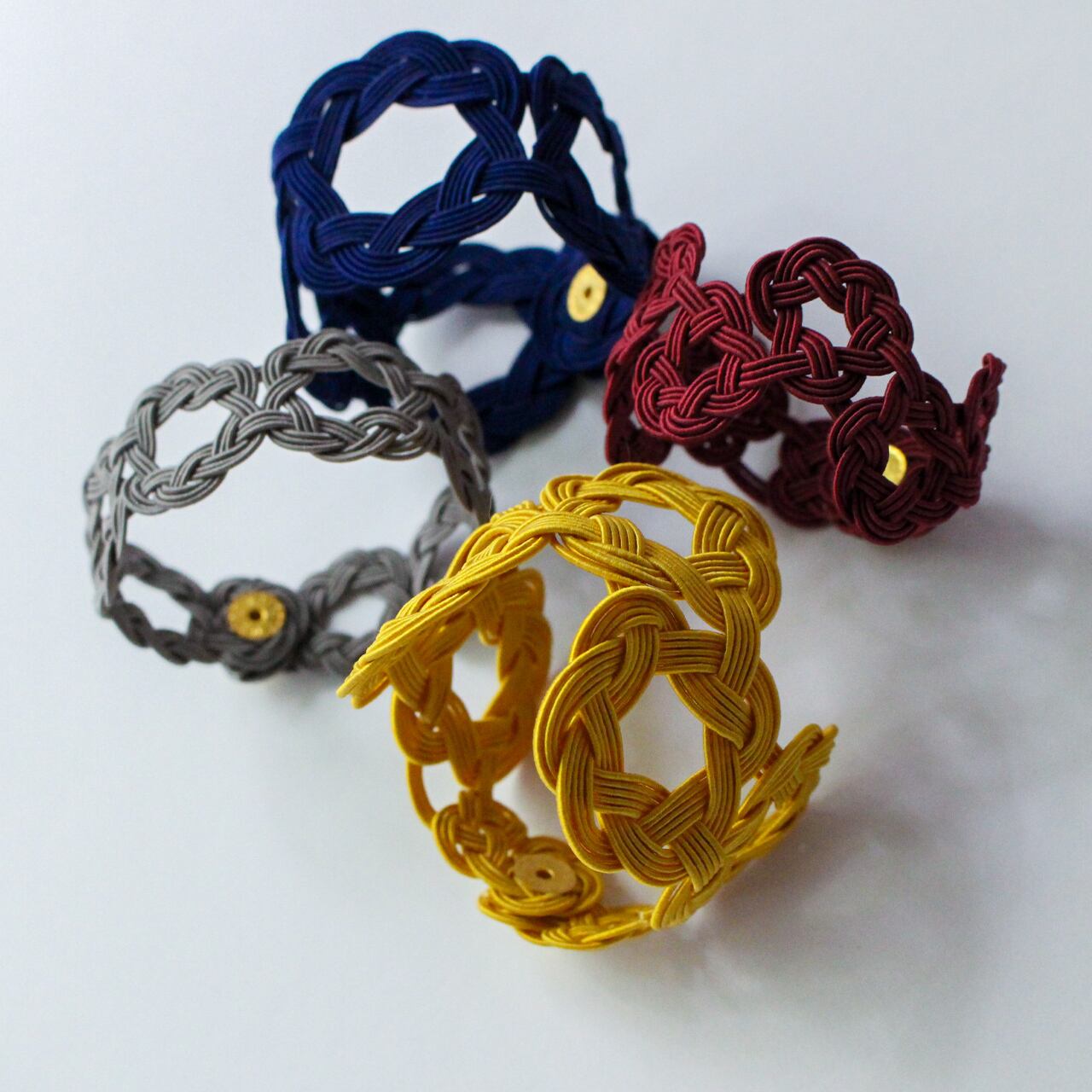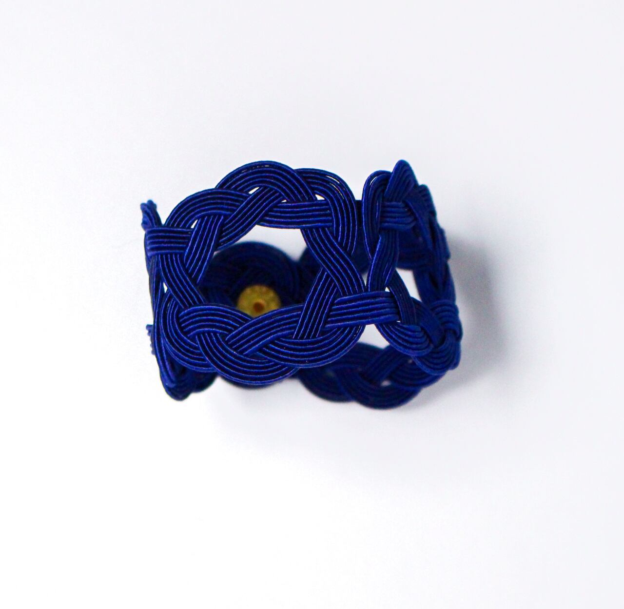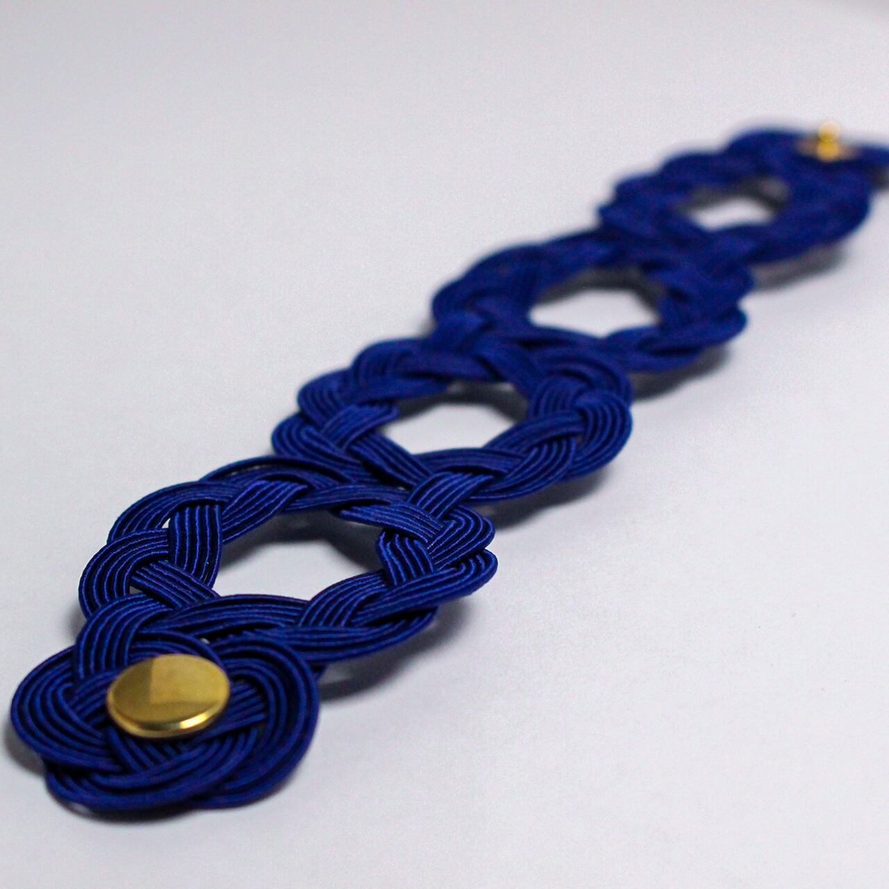水引細工の輪が連なり、手元に軽やかなリズムを生むアートアクセサリーシリーズ「WaO(ワオ)」のブレスレット。ネイビーカラー。