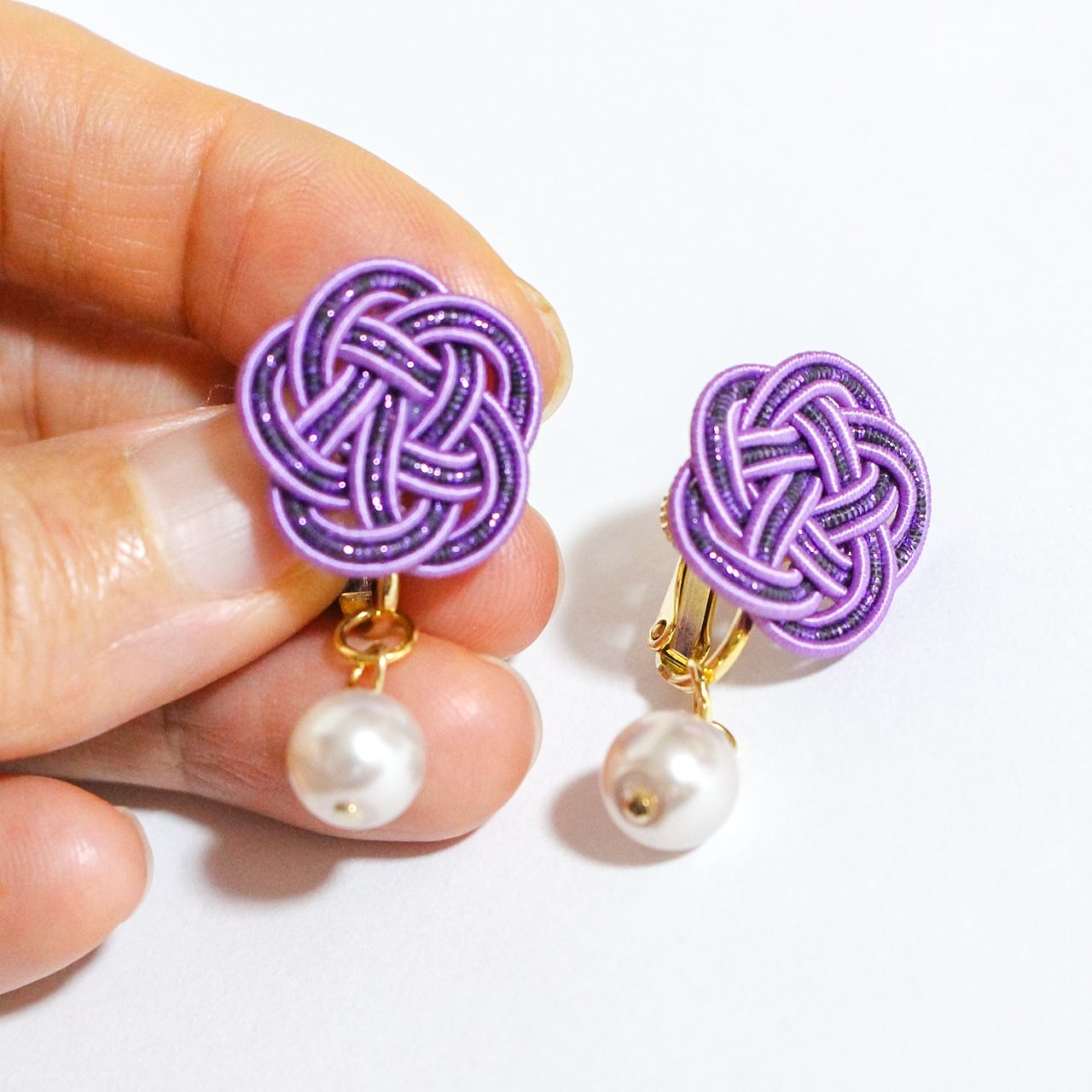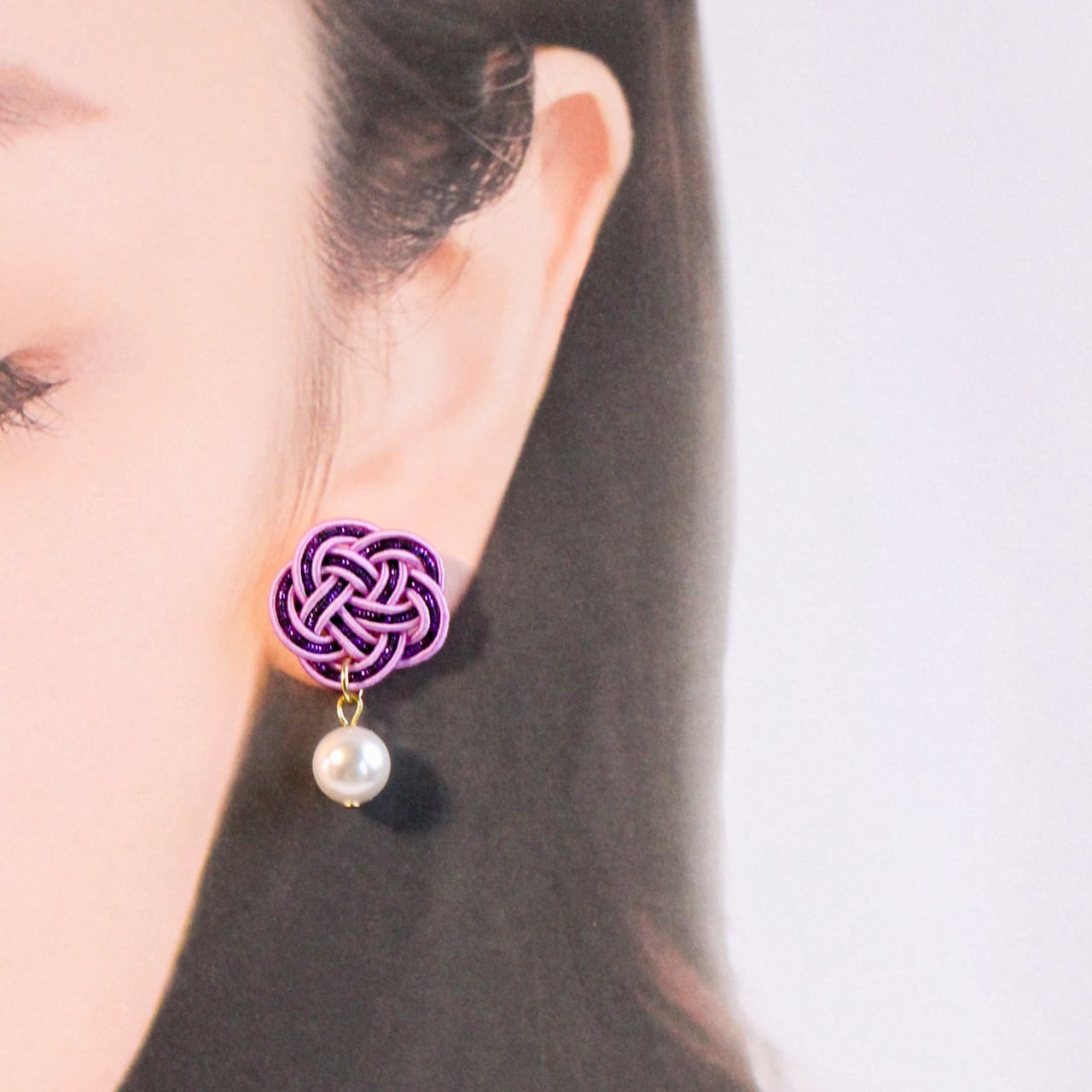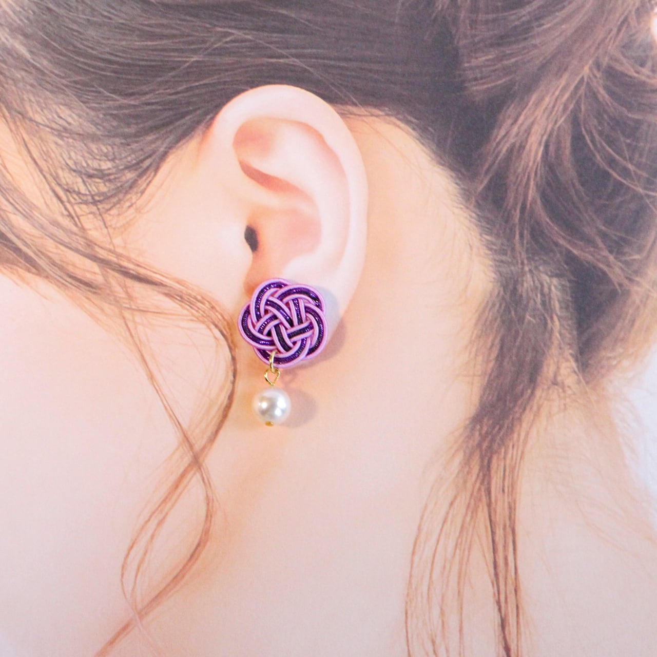 日本の伝統工芸「水引細工」の“梅結び”で結ばれた水引イヤリング パール付きです。