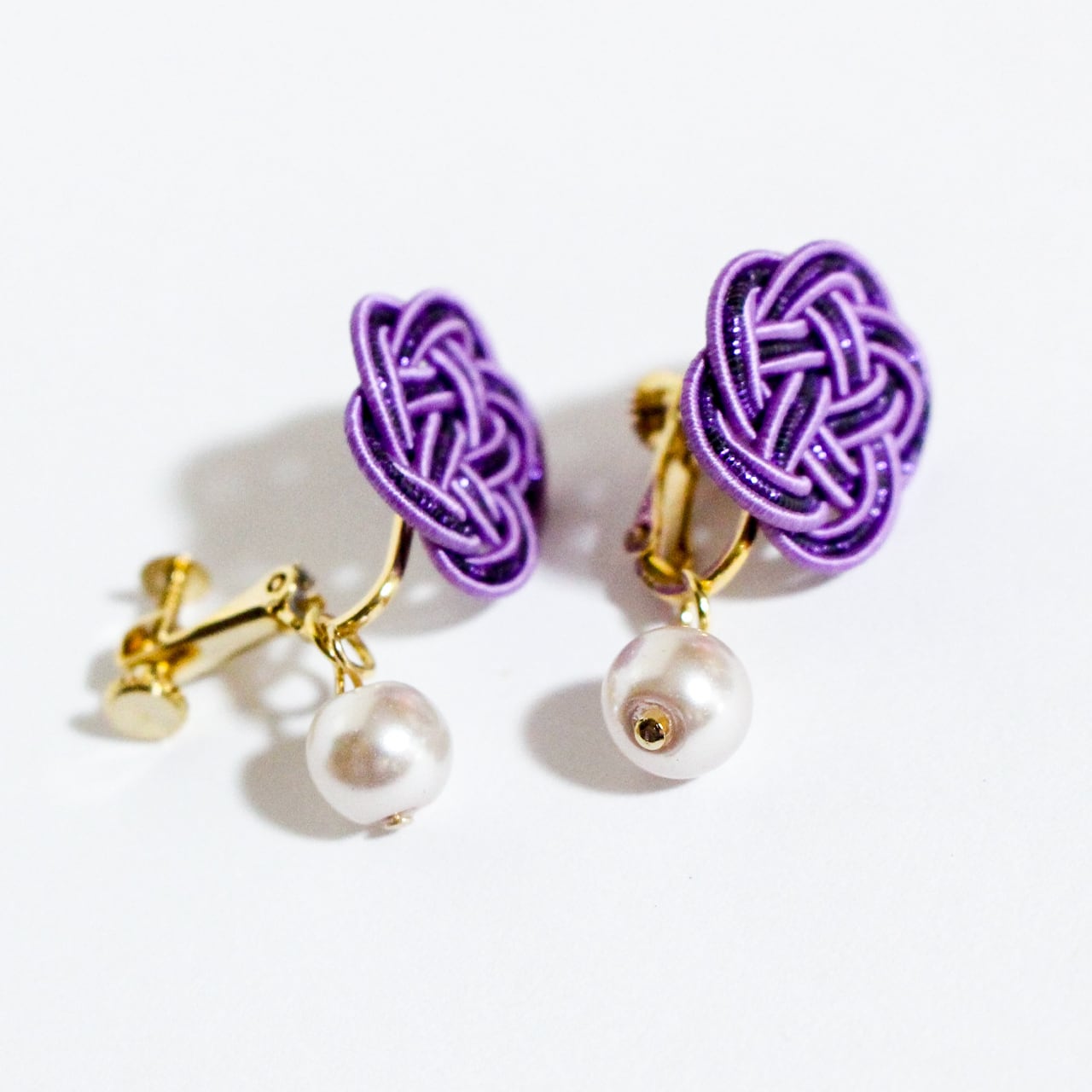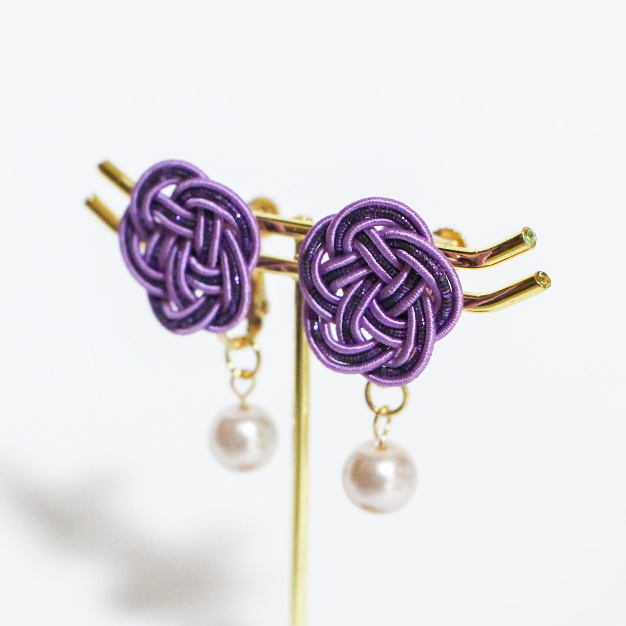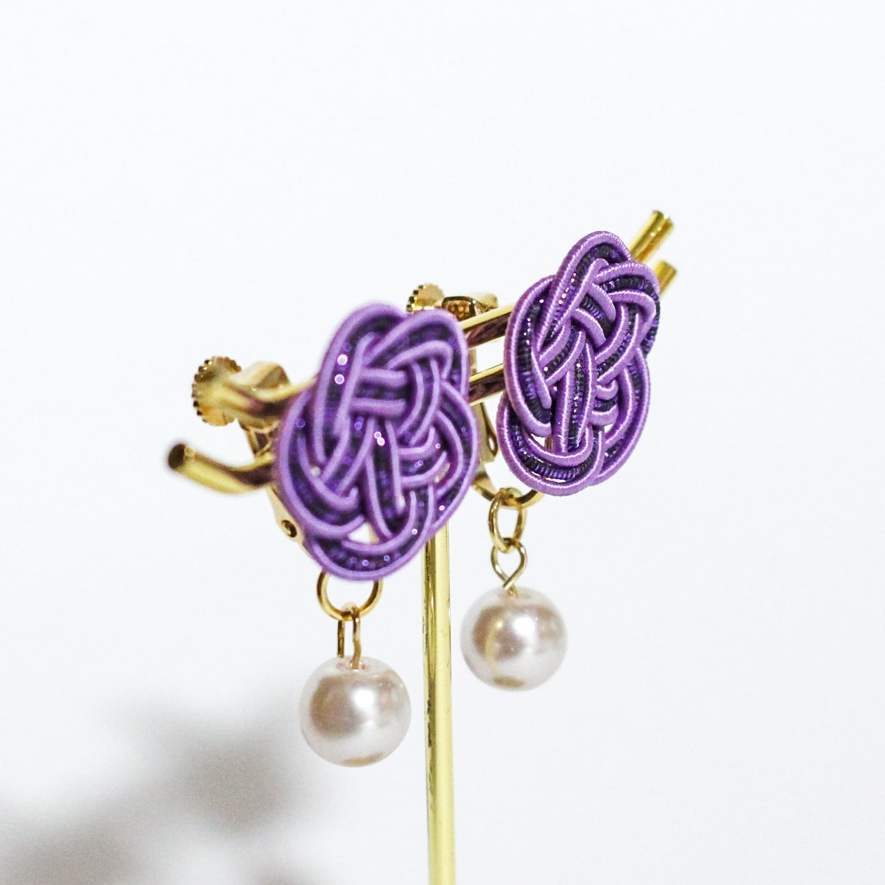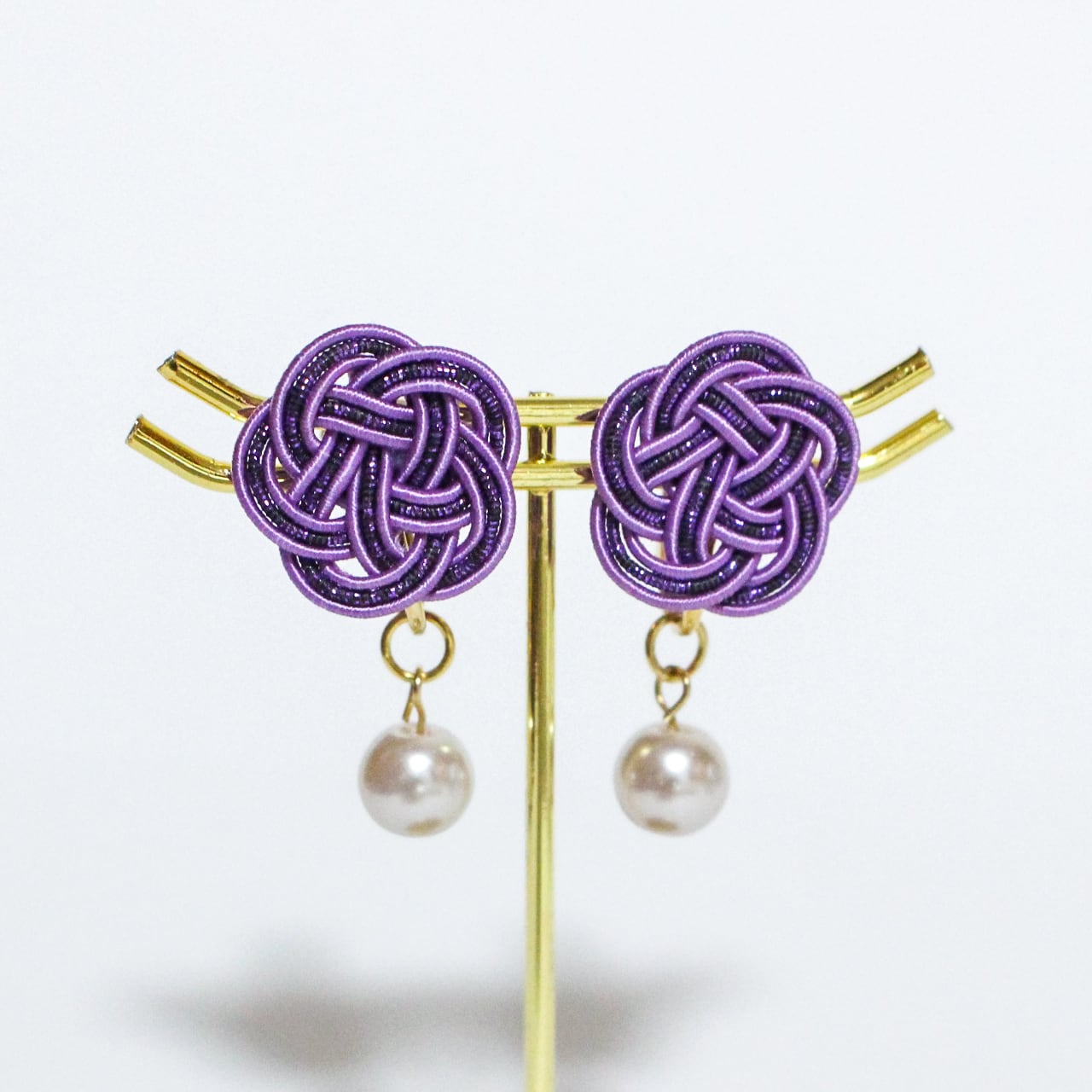 日本の伝統工芸「水引細工」の“梅結び”で結ばれた水引イヤリング パール付きです。