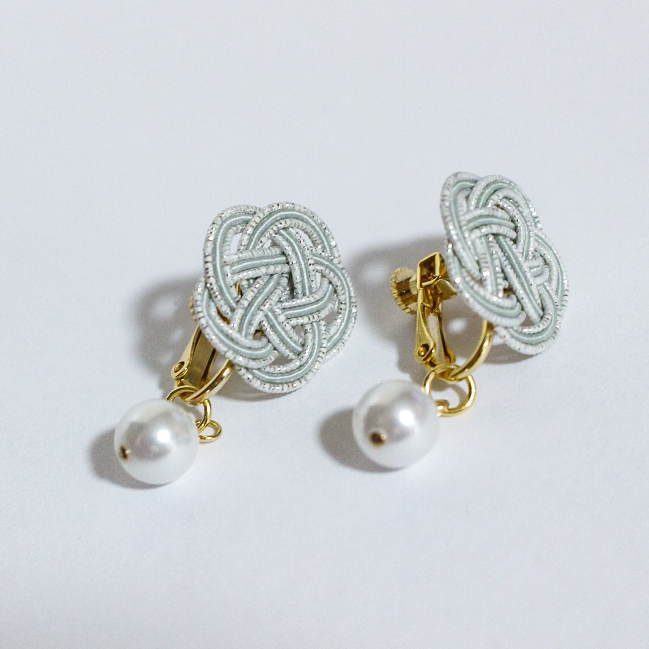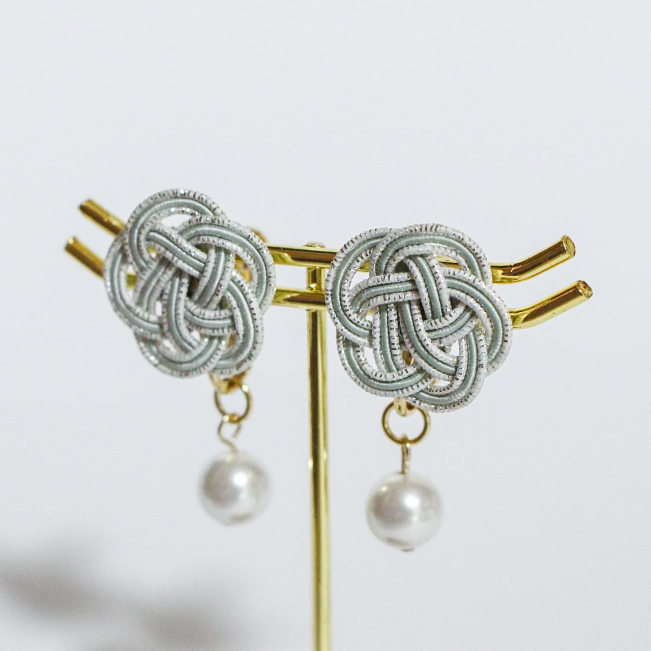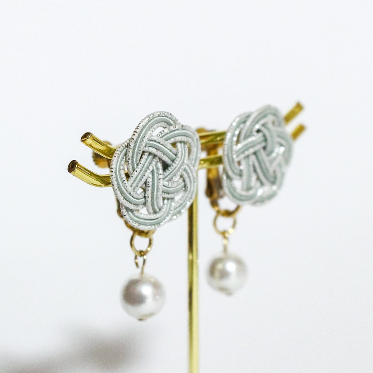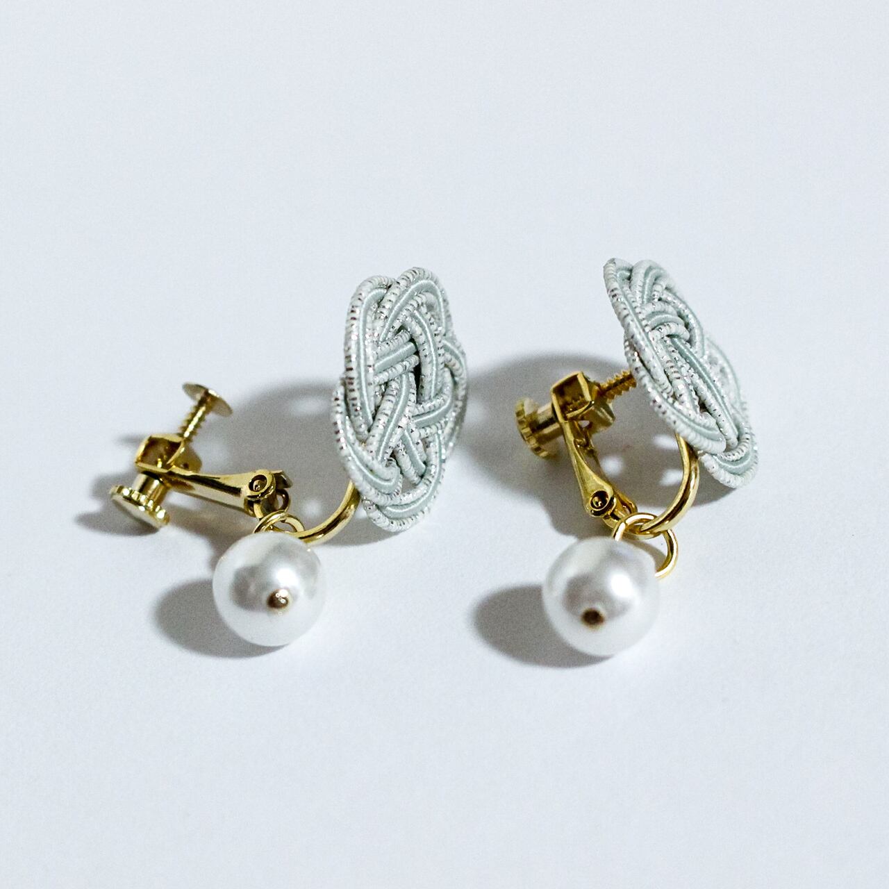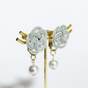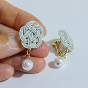 日本の伝統工芸「水引細工」の“梅結び”で結ばれた水引イヤリング パール付きです。