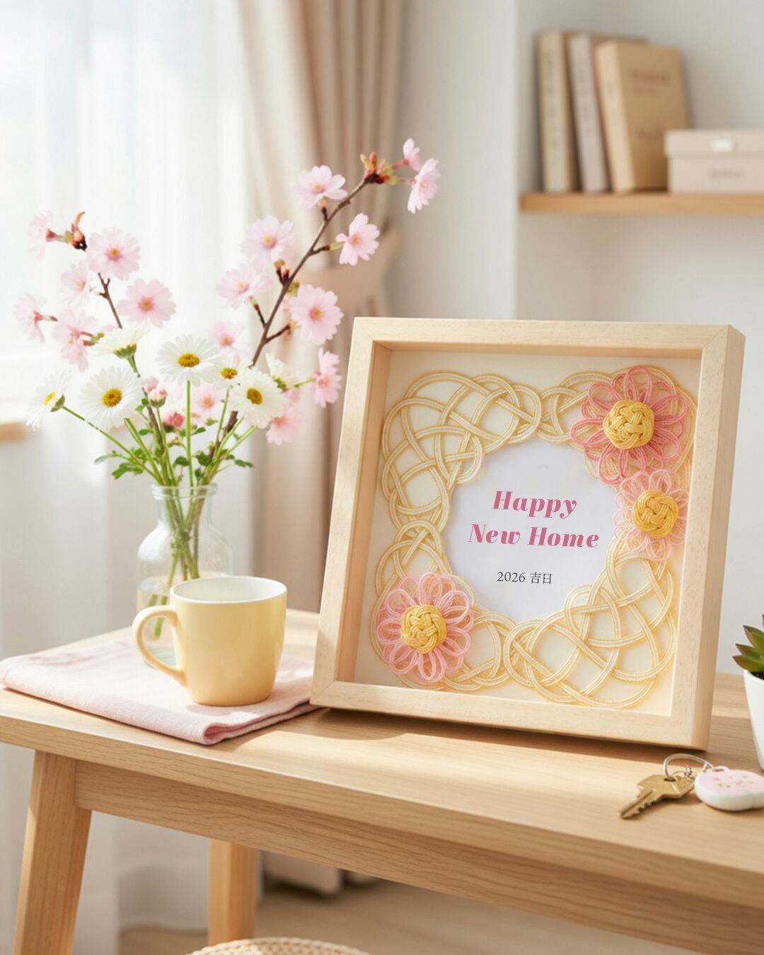 "真実の愛" の花言葉を持つ「マーガレット」を縁起物の水引で結んだお祝いフレームです。