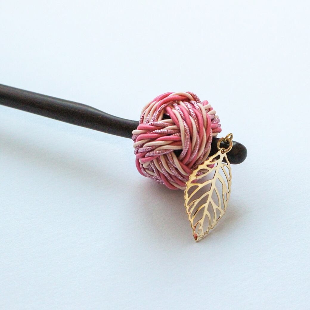 3種のピンク色水引を丸く結んだ飾りがかわいい「愛され甘味の薄紅りんご かんざし」です。