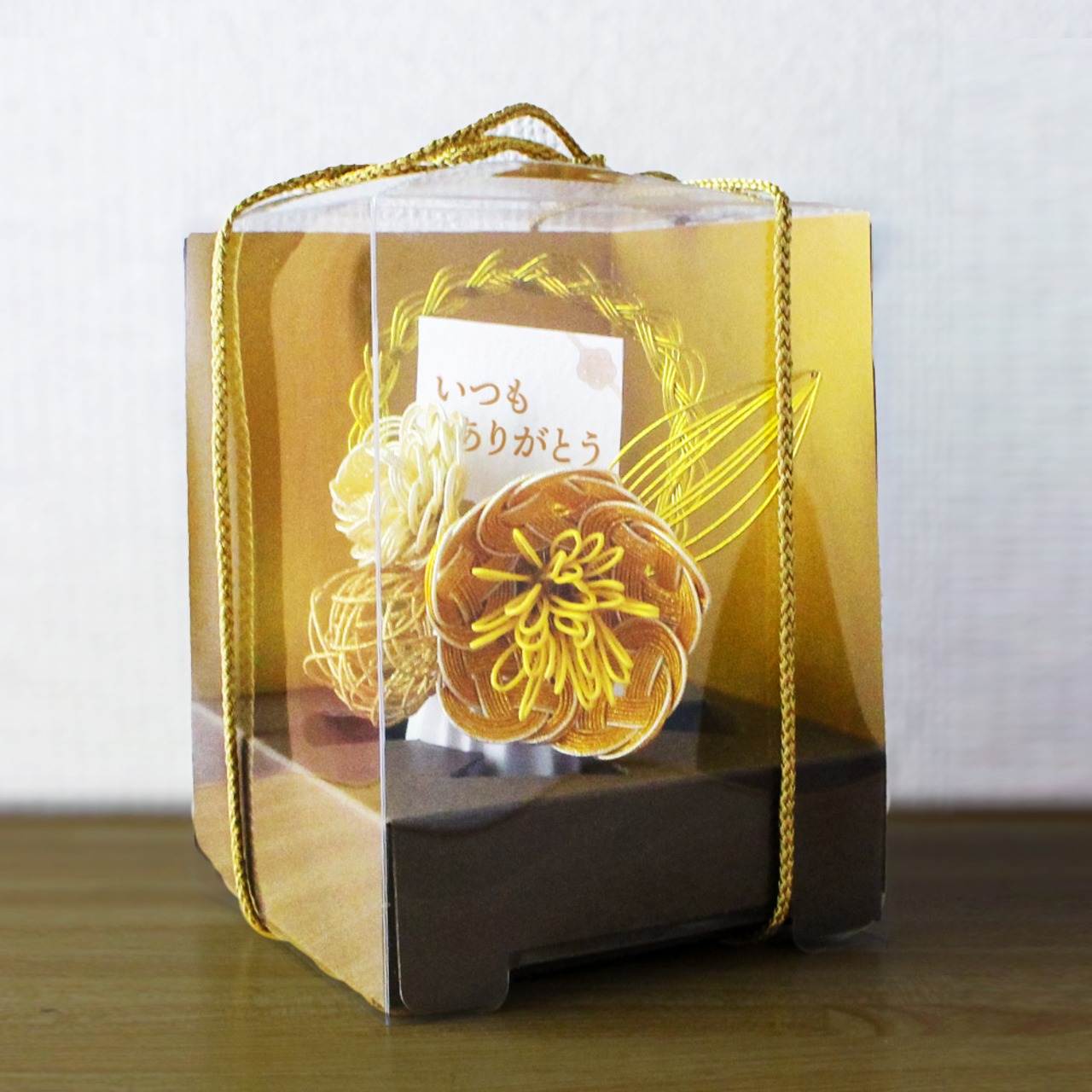 お祝いギフトやご自宅用に飾る場合は、金色の背景紙が付いたクリアボックスに金色の江戸打ちひもを結んでお届けいたします。