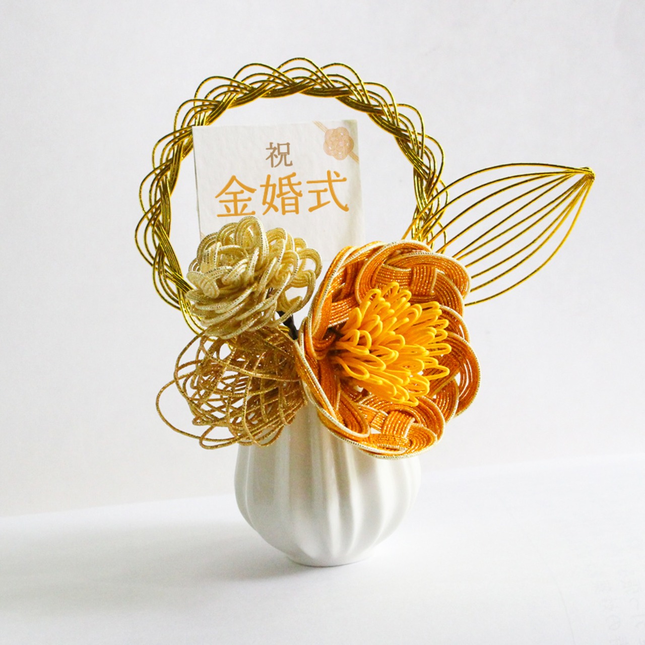 水引は古くから心を込めて贈り物に結ばれてきた装飾紐の工芸品です。一度結ぶと簡単にはほどけないことから「人・心・ご縁を結ぶ」と云われています。複数の技巧を凝らした立体的な水引細工の花々をインテリアとしてお楽しみいただけます。光沢が美しい水引素材を使用しているので、生花や造花とは全く違う煌びやかな存在感があります。